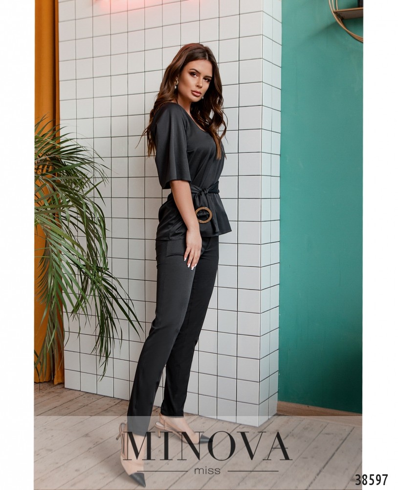 Строгий лёгкий костюм с брюками и блузой. Блуза с V-образным вырезом горловины, рукава немного расклешены, без манжет, застёжек и карманов нет. Брюки с высокой талией, с наглаженными «стрелками», застёгиваются на пуговицу и молнию под ширинкой, в пояс сзади вшита резинка, по бокам - карманы. В комплекте – пояс в тон с круглой пряжкой.