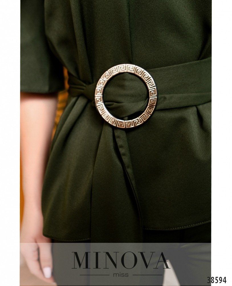 Строгий лёгкий костюм с брюками и блузой. Блуза с V-образным вырезом горловины, рукава немного расклешены, без манжет, застёжек и карманов нет. Брюки с высокой талией, с наглаженными «стрелками», застёгиваются на пуговицу и молнию под ширинкой, в пояс сзади вшита резинка, по бокам - карманы. В комплекте – пояс в тон с круглой пряжкой.