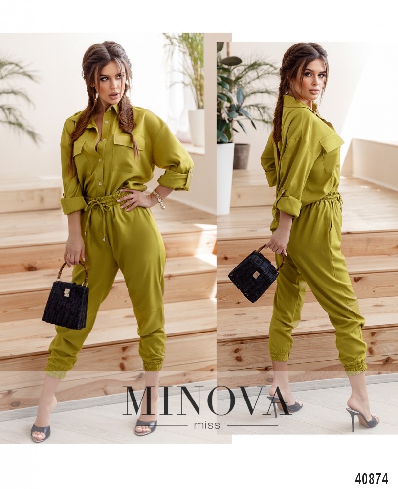 Элегантный костюм с рубашкой и брюками, рубашка с отложным воротничком и рядом пуговиц спереди на планке, на груди - накладные карманы с клапанами. Рукава с регулируемыми лентами. Брюки с высокой талией, без застёжек, в пояс вшит шнурок и резинка, по бокам - врезные карманы, в манжетах также резинки.