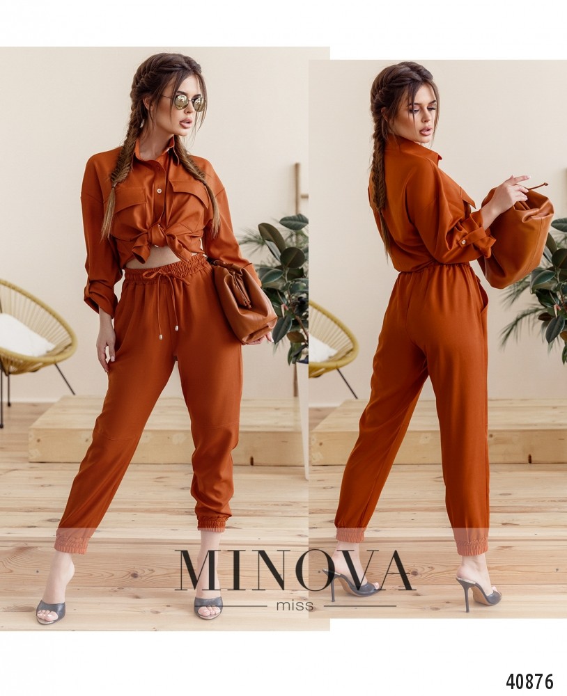 Элегантный костюм с рубашкой и брюками, рубашка с отложным воротничком и рядом пуговиц спереди на планке, на груди - накладные карманы с клапанами. Рукава с регулируемыми лентами. Брюки с высокой талией, без застёжек, в пояс вшит шнурок и резинка, по бокам - врезные карманы, в манжетах также резинки.