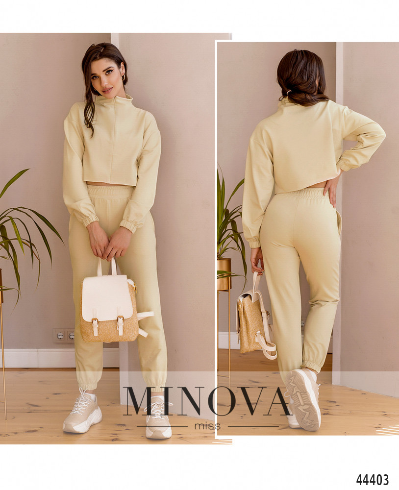 Минималистичный костюм с кофтой и брюками. Кофточка с декоративными диагональными швами на груди от плеча до талии, от воротничка-стоечки до груди вшита потайная молния. Карманов нет, подол не обмётан швом, в рукава вшиты резинки на манжетах. Линия плеча немного приспущена. Брюки с высокой посадкой, в пояс и манжеты вшита резинка, по бокам - карманы в шве.