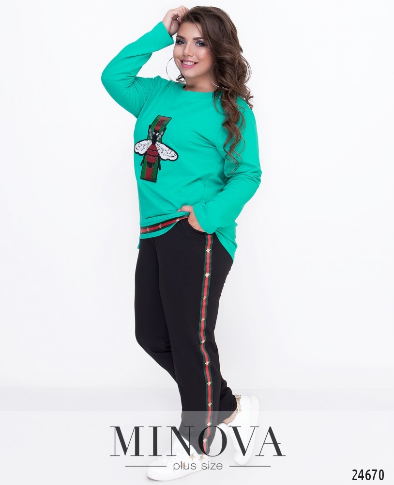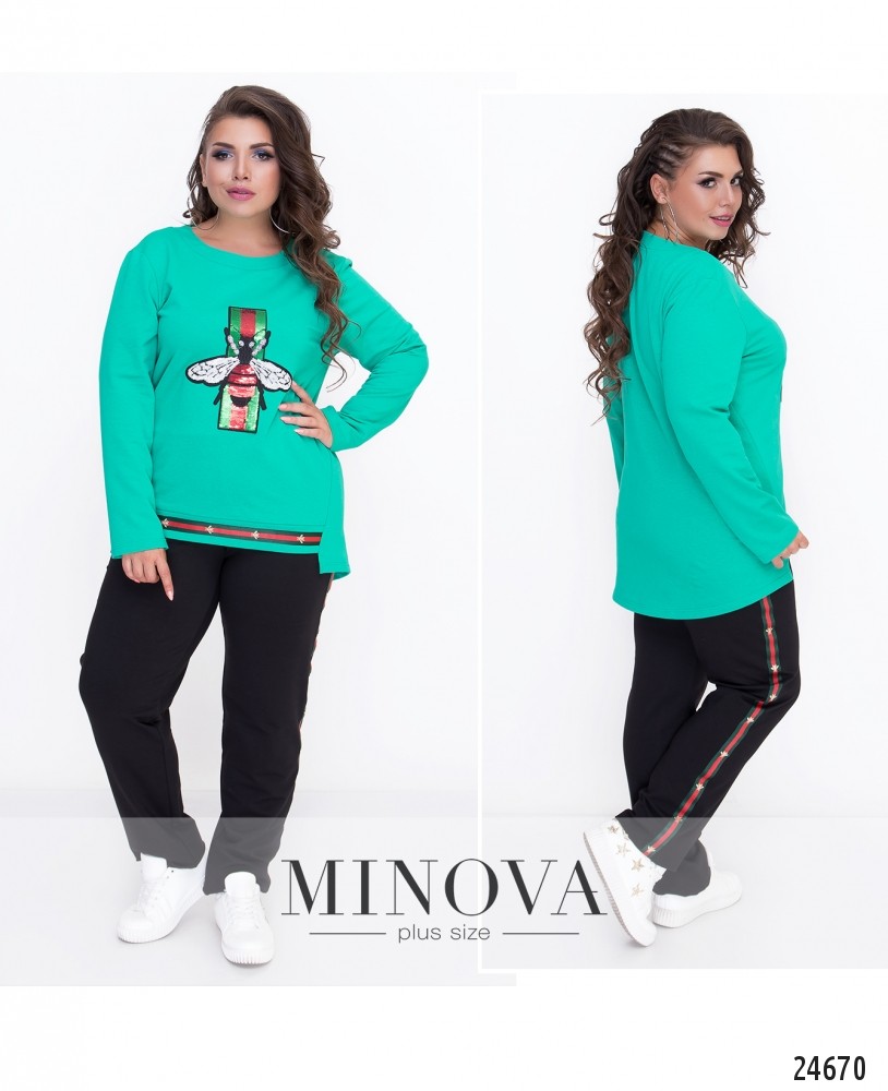 Яркий, привлекающий к себе внимание, спортивный костюм с вышивкой из пайеток. Костюм состоит топа прямого кроя с длинными рукавами и удлиненной закругленной спинкой. Лицевая сторона подола оторочена кантом. Прямые брюки с карманами на высокой посадке с поясом-резинкой дополнены цветными лампасами. Штанины с небольшими манжетами.