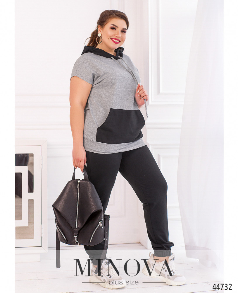 Стильный костюм-двойка батал, толстовка с коротким рукавом "летучая мышь", в наличии капюшон с пропущенным через него шнурком. На талии - карман-кенгуру. Подол с манжетом. Застёжек нет. Брюки с высокой талией, в пояс и в манжеты вшиты резинки, по бокам - карманы в шве. Застёжек нет.