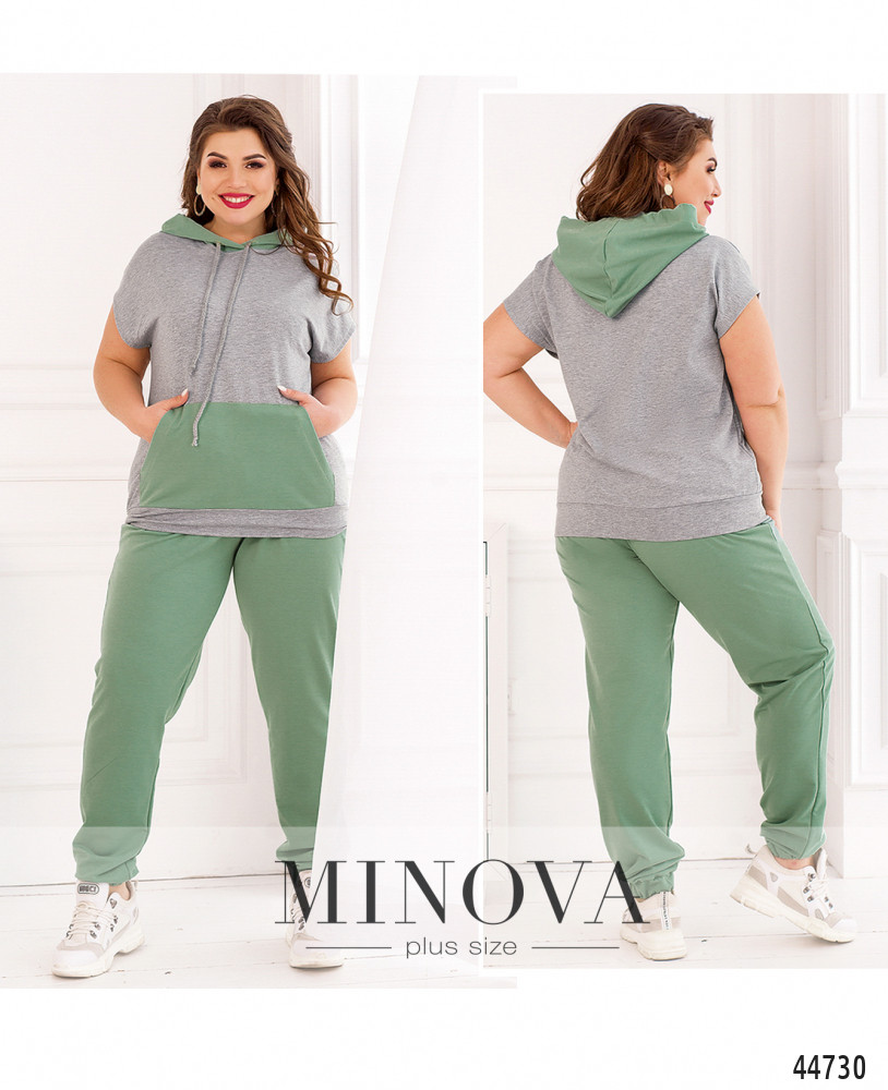 Стильный костюм-двойка батал, толстовка с коротким рукавом "летучая мышь", в наличии капюшон с пропущенным через него шнурком. На талии - карман-кенгуру. Подол с манжетом. Застёжек нет. Брюки с высокой талией, в пояс и в манжеты вшиты резинки, по бокам - карманы в шве. Застёжек нет.