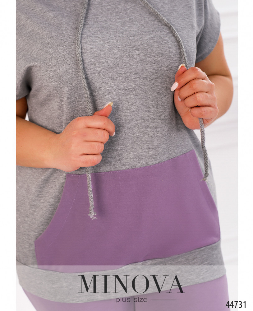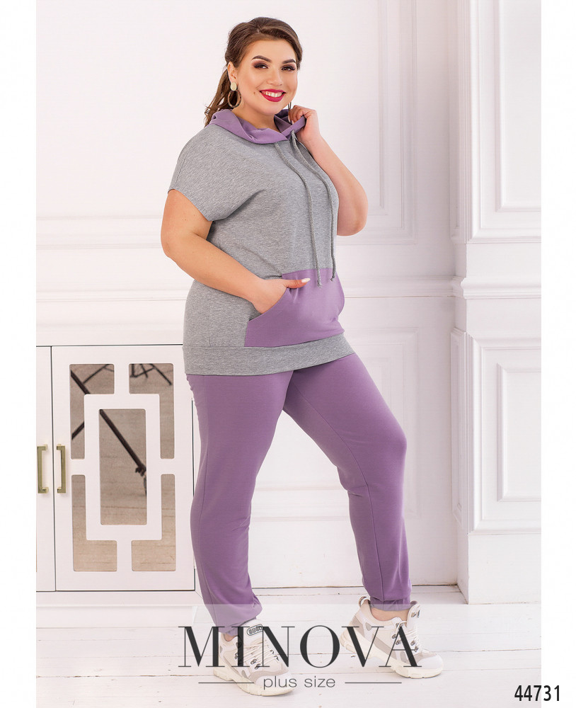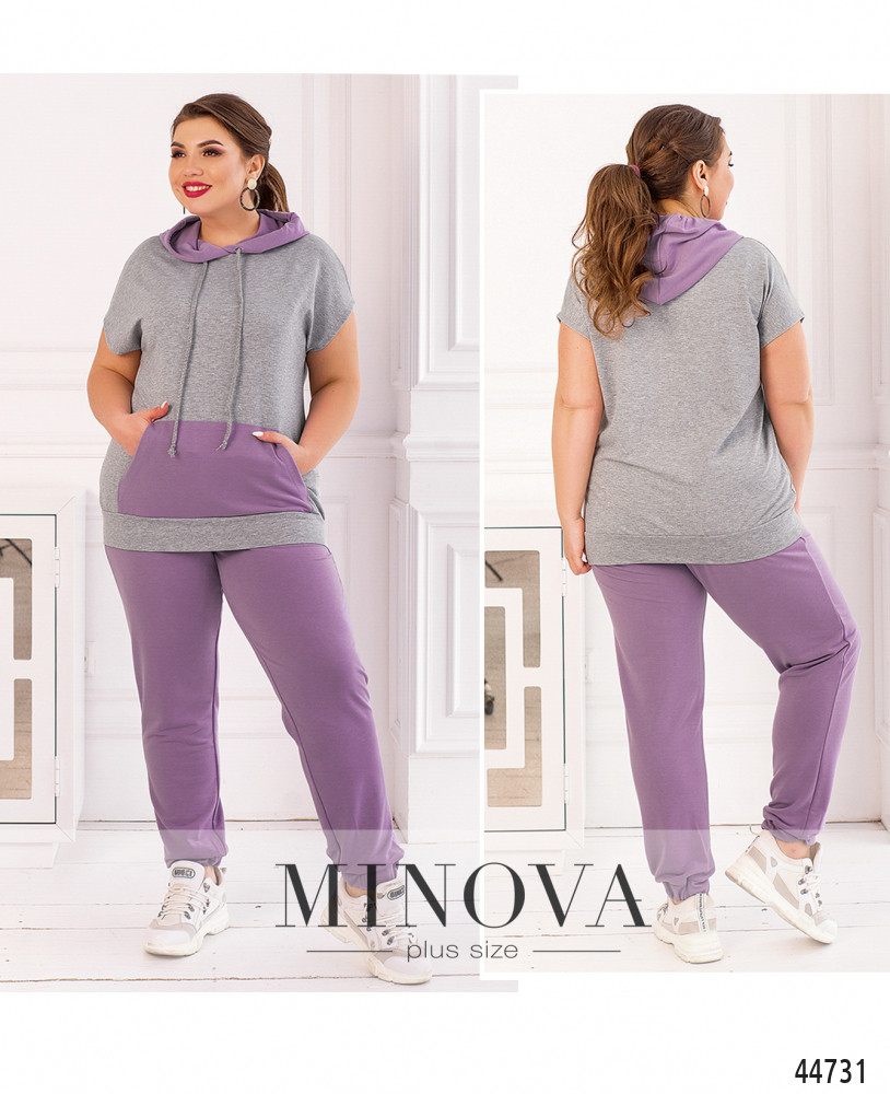 Стильный костюм-двойка батал, толстовка с коротким рукавом "летучая мышь", в наличии капюшон с пропущенным через него шнурком. На талии - карман-кенгуру. Подол с манжетом. Застёжек нет. Брюки с высокой талией, в пояс и в манжеты вшиты резинки, по бокам - карманы в шве. Застёжек нет.