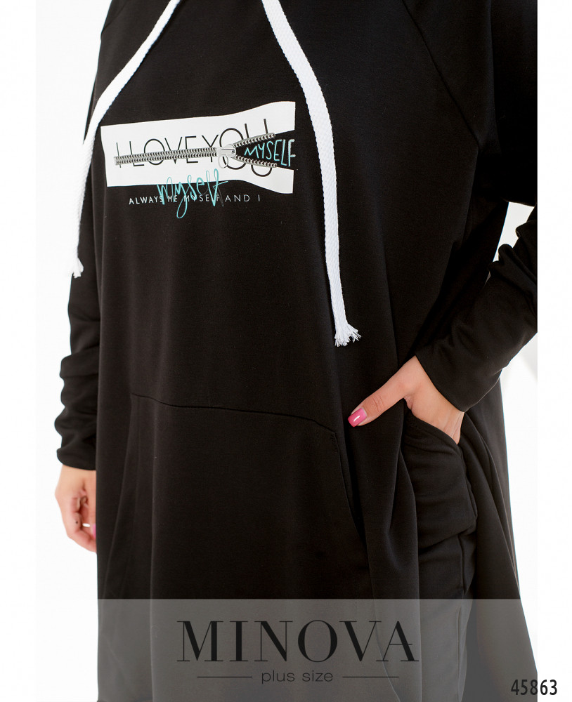 Оригинальный костюм с длинной толстовкой и брюками. Толстовка с капюшоном, через него пропущен шнурок. Рукава с мягкими манжетами, спереди  - карман-кенгуру. По бокам - очень длинные разрезы. На груди декоративный принт. Брюки с манжетами, в пояс вшита резинка, по бокам - карманы в шве, посадка высокая.