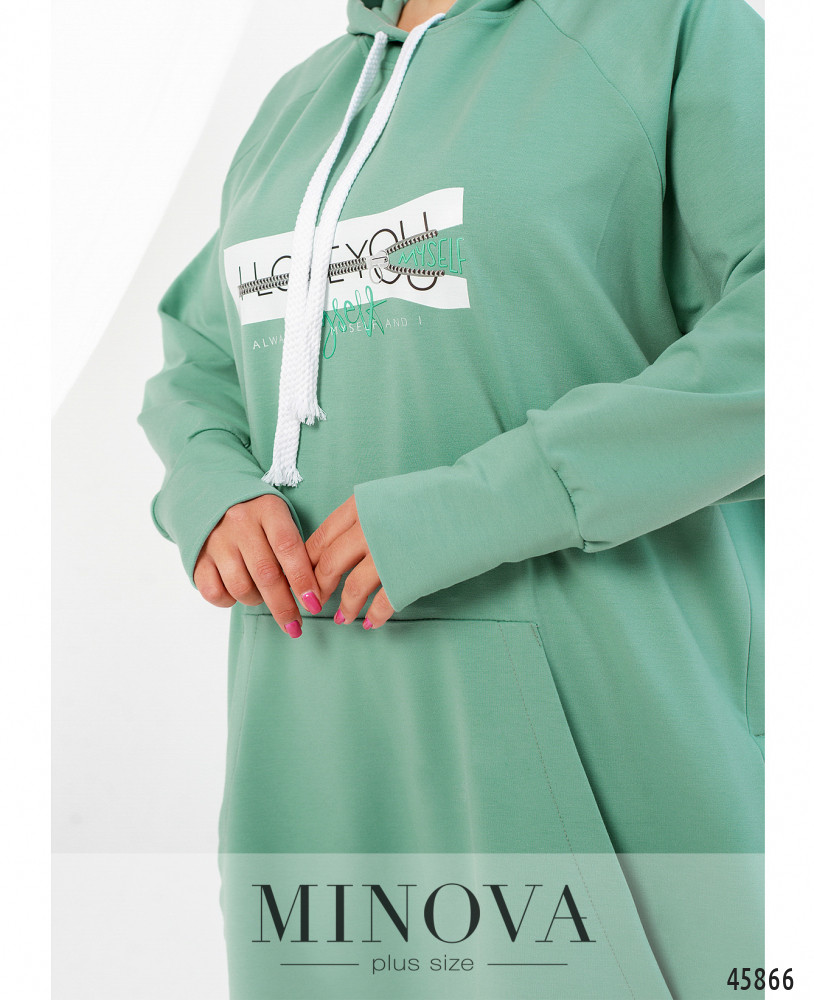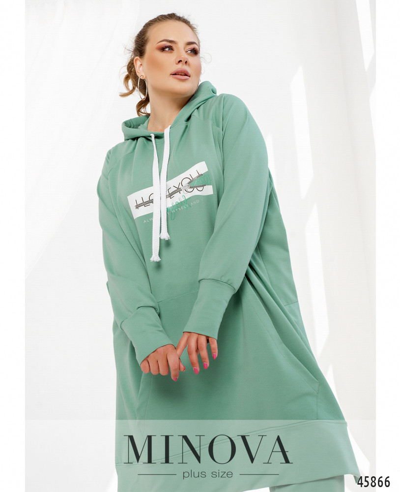 Оригинальный костюм с длинной толстовкой и брюками. Толстовка с капюшоном, через него пропущен шнурок. Рукава с мягкими манжетами, спереди  - карман-кенгуру. По бокам - очень длинные разрезы. На груди декоративный принт. Брюки с манжетами, в пояс вшита резинка, по бокам - карманы в шве, посадка высокая.