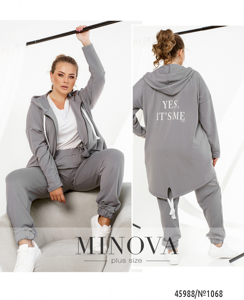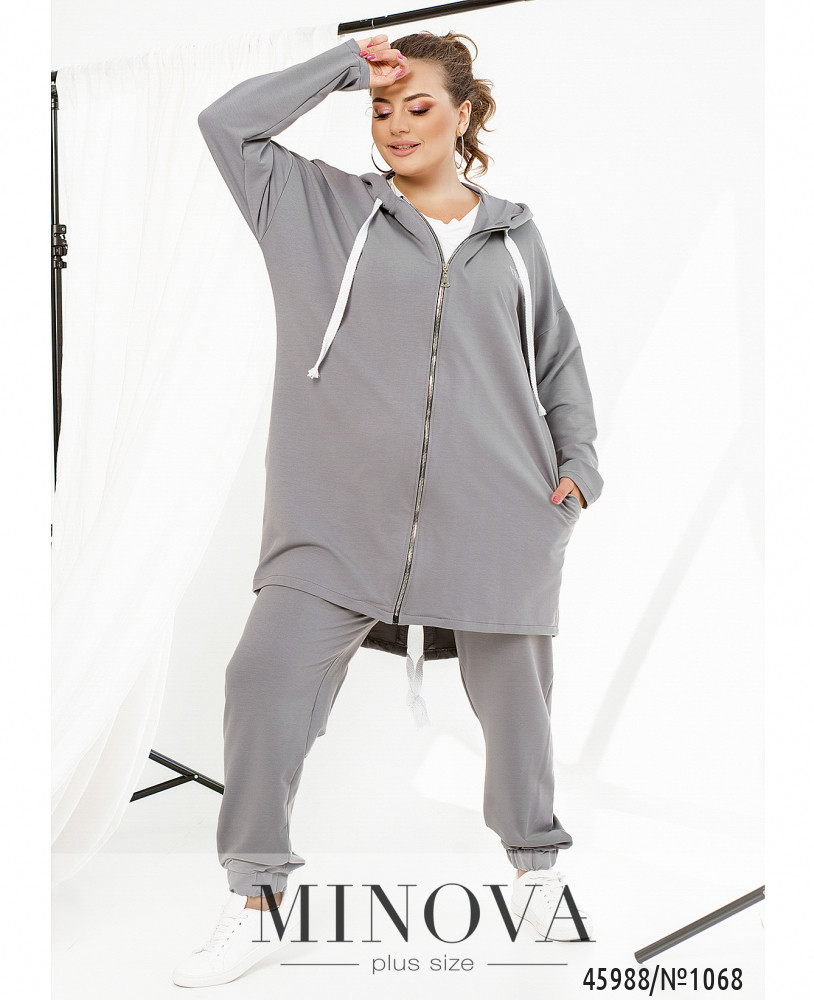 Оригинальный спортивный костюм порадует поклонниц практичной одежды на каждый день. Брюки с высокой посадкой дополнены манжетами и врезными карманами по бокам, а снизу - манжетами, в которые вшита резинка. Удлиненная туника, застегивающаяся на змейку, с капюшоном, карманами, и ассиметричным низом, удлиненным по спинке, декорирована принтом.