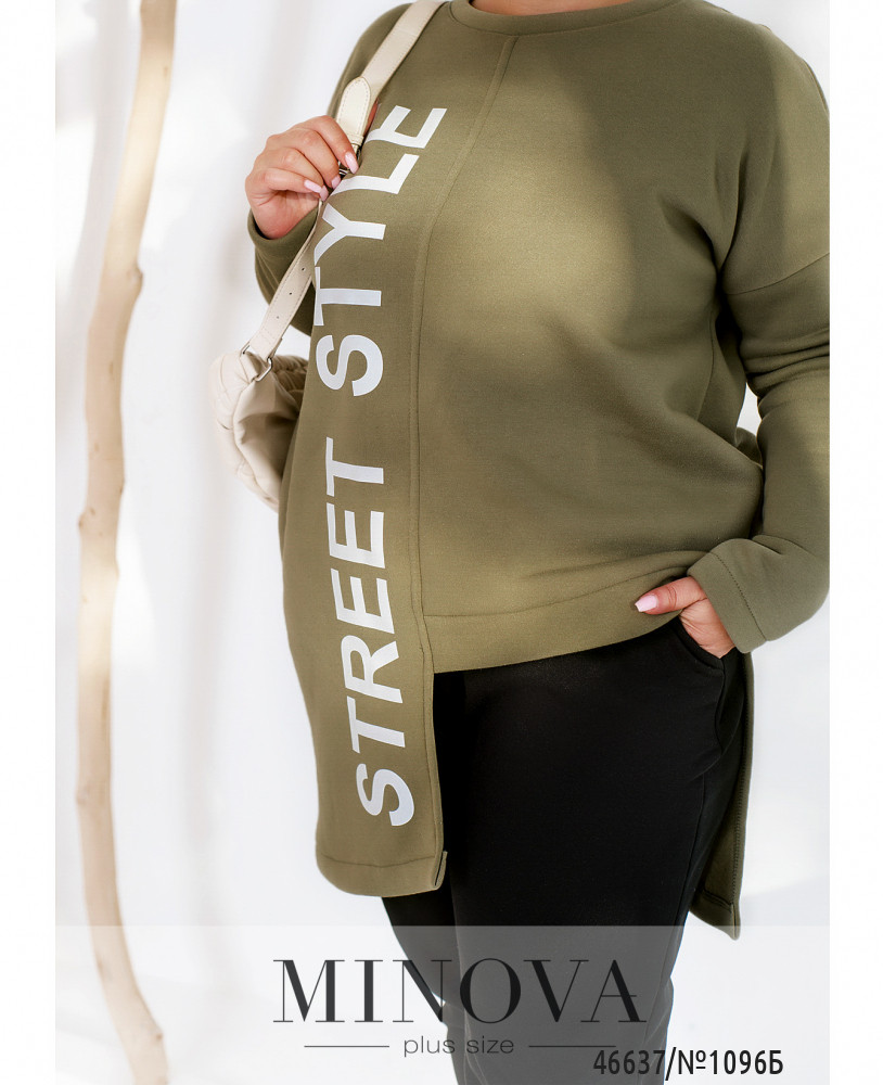 Контрастный спортивный костюм, дополненный принтами, отлично сочетается с кроссовками и объемными джинсовыми куртками. В комплект входят лаконичные брюки-джоггеры с карманами в боковых швах и резинками, вшитыми по линии талии и по низу штанин, а также удлиненная туника-свитшот с ассиметричным низом, дополненная длинными рукавами с приспущенной линией плеч. Пояс НЕ входит в комплект.