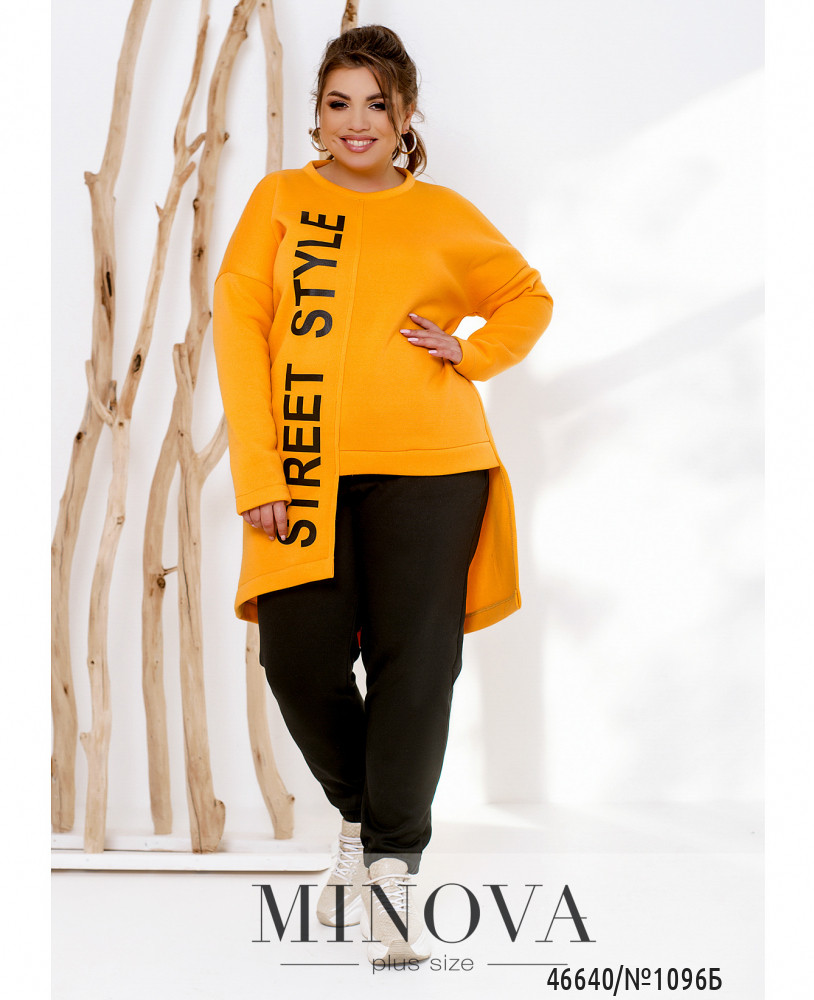 Контрастный спортивный костюм, дополненный принтами, отлично сочетается с кроссовками и объемными джинсовыми куртками. В комплект входят лаконичные брюки-джоггеры с карманами в боковых швах и резинками, вшитыми по линии талии и по низу штанин, а также удлиненная туника-свитшот с ассиметричным низом, дополненная длинными рукавами с приспущенной линией плеч. Пояс НЕ входит в комплект.