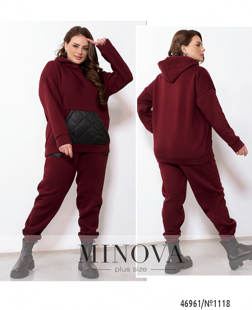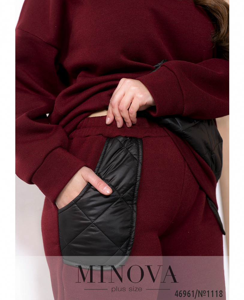 Оригинальный спортивный костюм может стать любимой вещью для женщины, ценящей практичность и не забывающей о модных тенденциях. В комплект входят однотонные брюки-джоггеры на резинке с накладными карманами, выполненными из стеганой плащевой ткани, а также модное худи с капюшоном и таким же стеганым карманом-кенгуру, как и на брюках.