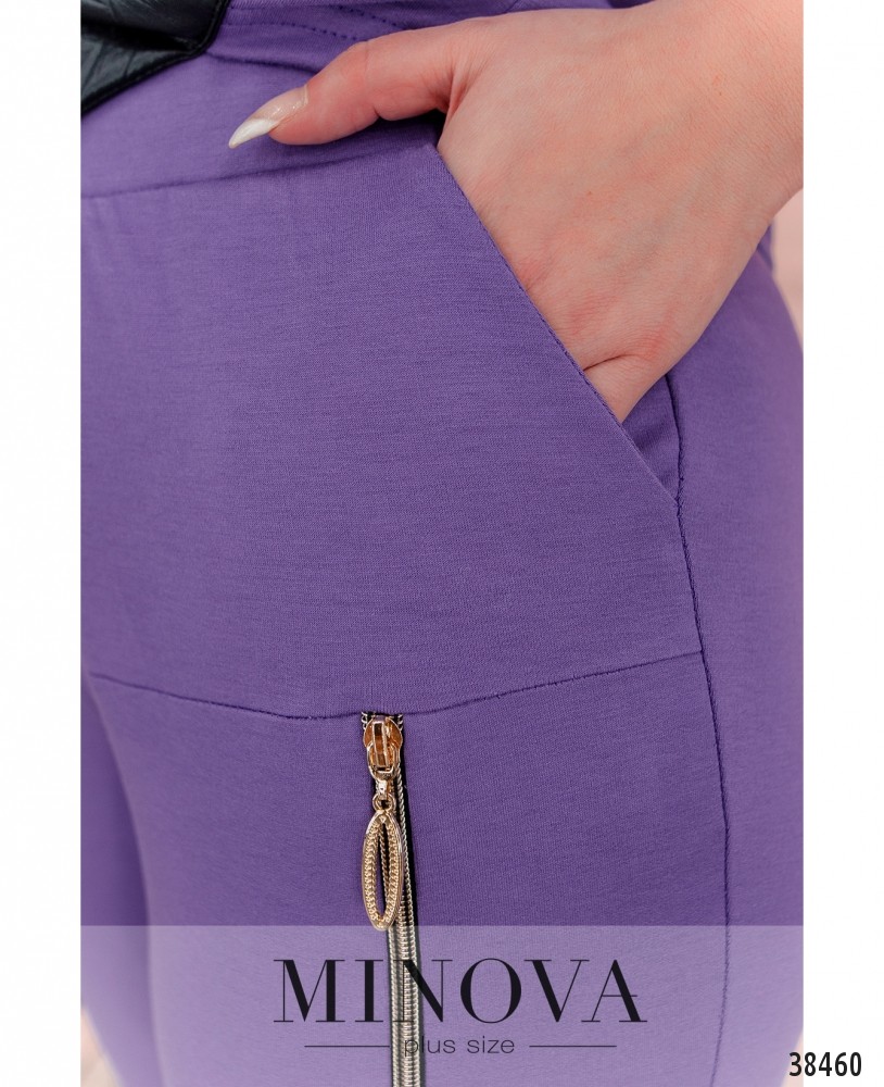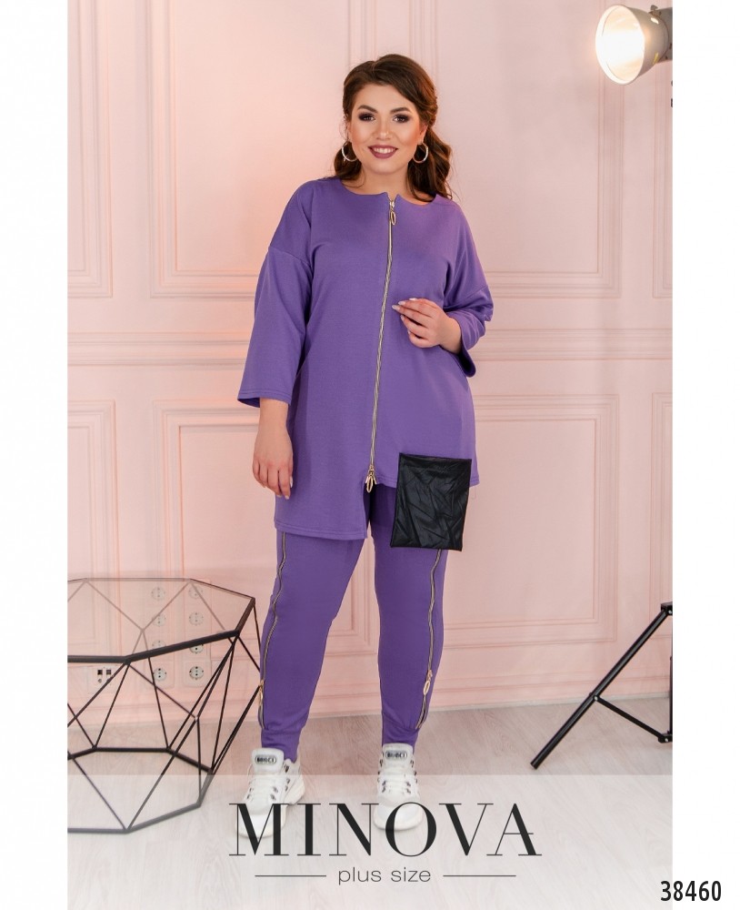 Милый и оригинальный однотонный костюм-двойка батал с кофточкой и брюками. Кофточка на молнии спереди, застёгивается на два бегунка, подол асимметричный, слева короче. Слева подшит накладной контрастный карман. Рукава без манжет. Брюки с высокой талией, в пояс вшита резинка, с мягкими манжетами снизу, по бокам - декоративные молнии во всю длину, также с двумя бегунками, в наличии карманы.