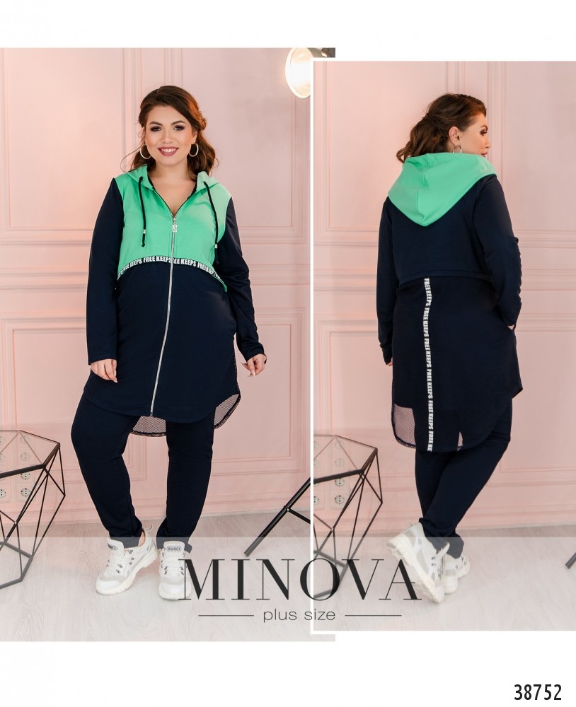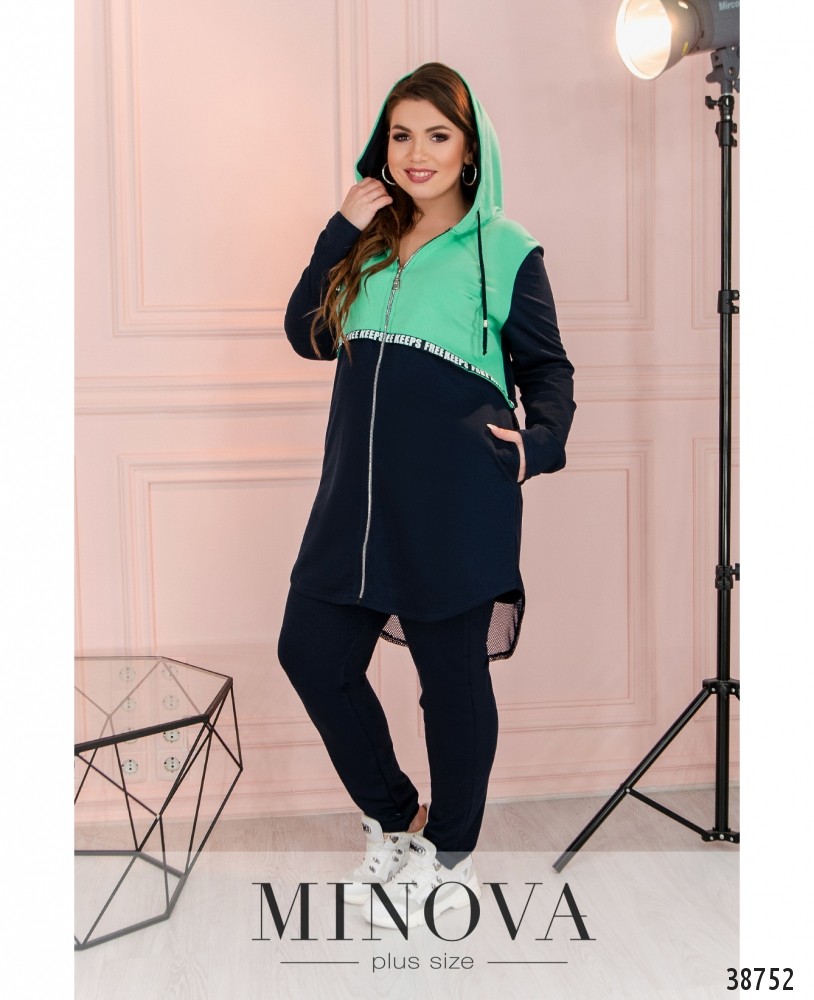 Привлекательный костюм-двойка большого размера, в комплекте длинная кофта и брюки. Брюки высокой посадки, с врезными карманами по бокам, в пояс вшита резинка. Туника застёгивается на молнию от верха до середины груди, с капюшоном и шнурком, спереди - сквозной карман, украшенный декоративными лентами. Рукава с небольшими манжетами из трикотажа-рибаны, такой же манжет - снизу на тунике.