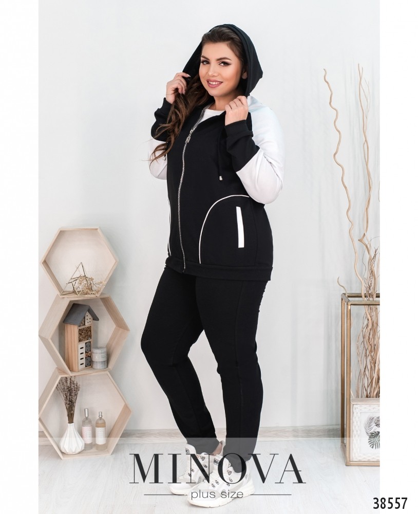 Удобный повседневный костюм-двойка плюс сайз с кофтой и брюками. Кофта с капюшоном, через капюшон пропущен шнурок, по бокам – врезные карманы и декоративные швы. Рукава с мягкими манжетами. Застёгивается на молнию по центру. Брюки с высокой посадкой, вшитой в пояс резинкой, по бокам врезные карманы.