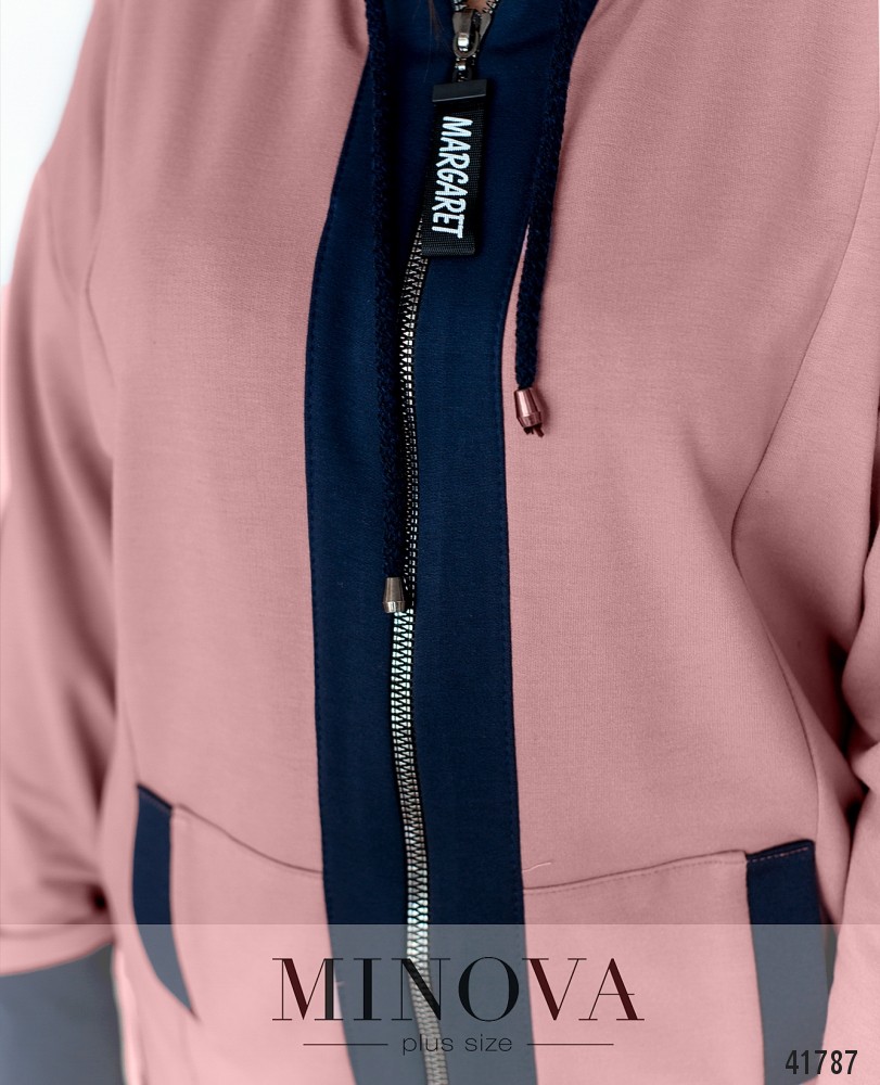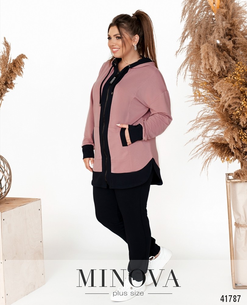 Мягкий и удобный костюм-двойка плюс сайз. Свитшот с капюшоном, по бокам - врезные карманы, застёгивается на молнию по центру, по бокам подола скруглённые разрезы. Брюки с высокой талией и вшитой в пояс резинкой, в наличии карманы.