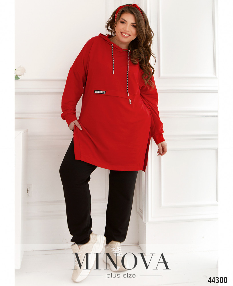 Стильный спортивный костюм батал с длинной толстовкой, толстовка с капюшоном, через отверстия, укреплённые люверсами, пропущен шнурок. По центру - вшитый под планкой и под молнией карман. Рукава с мягкими манжетами. Брюки с высокой талией, в пояс вшита резинка, по бокам - карманы. На подоле - длинные разрезы сбоку.
