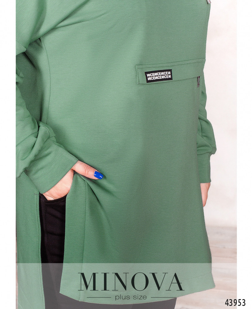 Стильный спортивный костюм батал с длинной толстовкой, толстовка с капюшоном, через отверстия, укреплённые люверсами, пропущен шнурок. По центру - вшитый под планкой и под молнией карман. Рукава с мягкими манжетами. Брюки с высокой талией, в пояс вшита резинка, по бокам - карманы. На подоле - длинные разрезы сбоку.