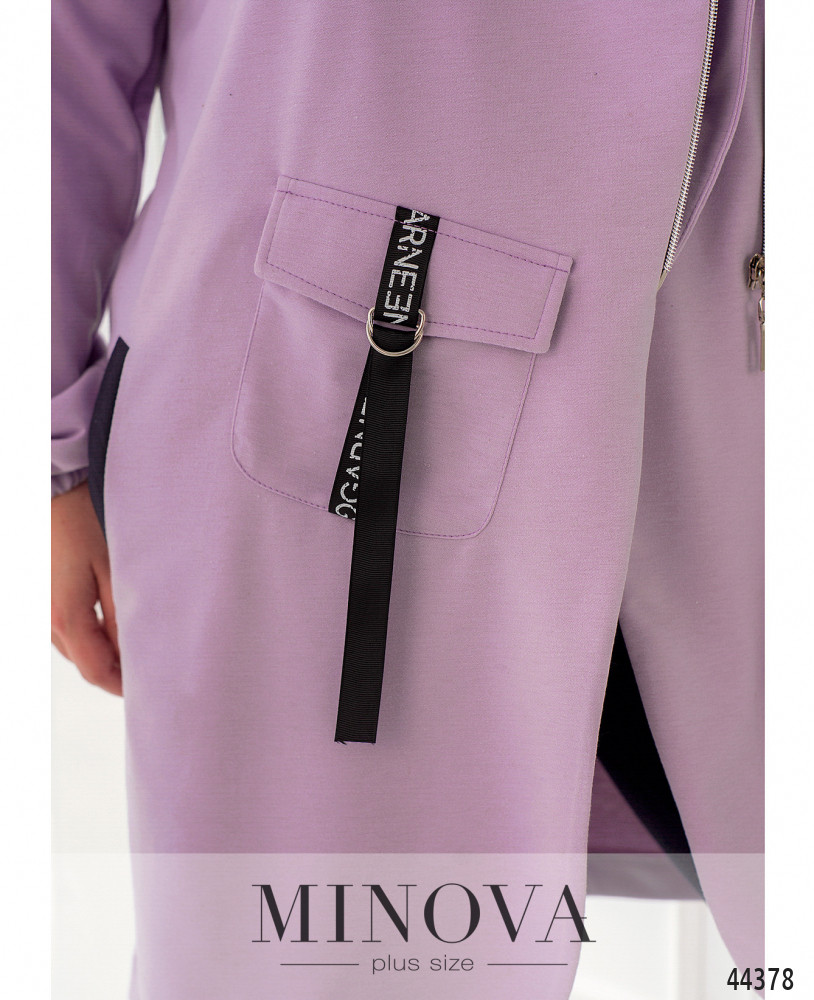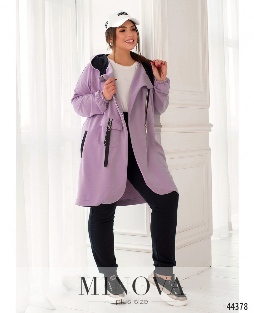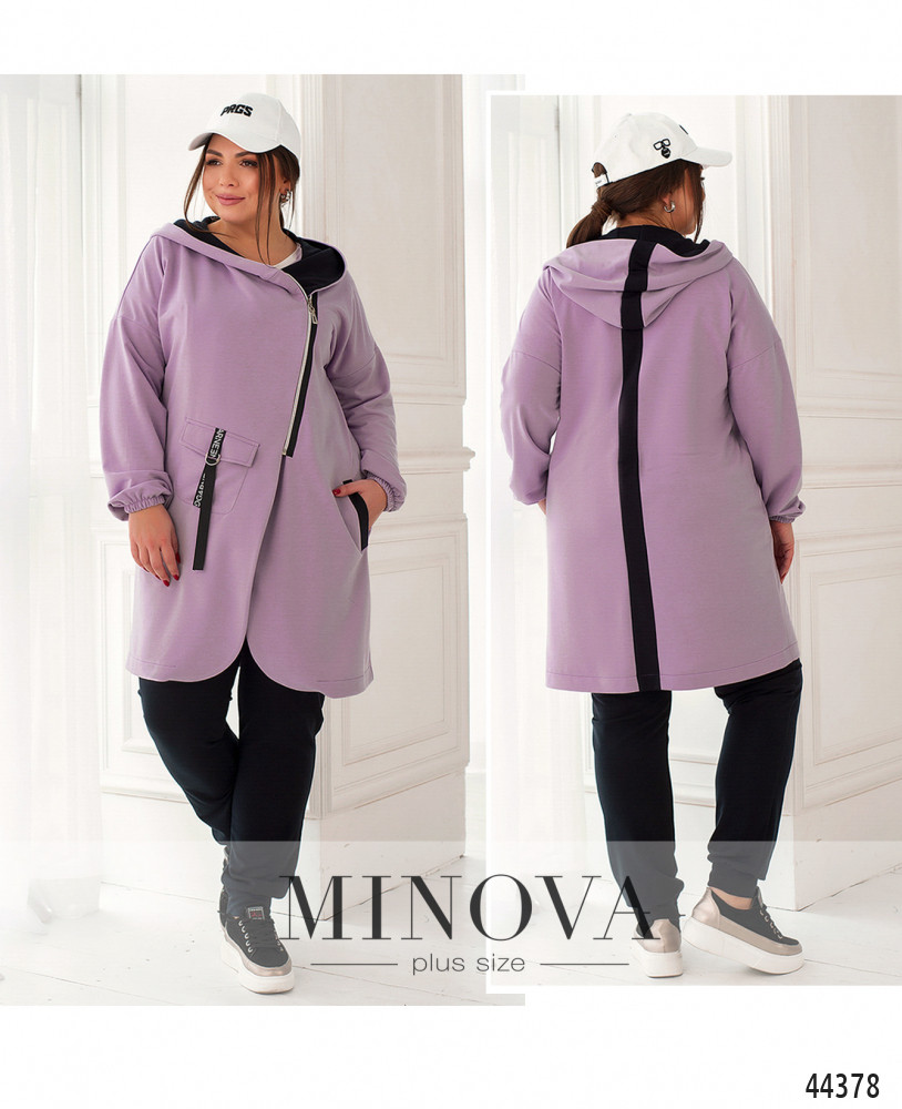 Элегантный и стильный спортивный костюм большого размера. Туника длинная, со змейкой, расположенной слева. Змейка не в полную длину, под ней - ещё отрез ткани. Справа на бедре накладной карман с клапаном, с лентой и металлическими полукольцами. По бокам - карманы в шве под контрастными листочками. В наличии капюшон без шнурков, двухслойный. Рукава со вшитыми в манжеты резинками. Туника без подкладки. На спинке и на капюшоне - продольная декоративная лента. Брюки с высокой посадкой, с манжетами, в пояс вшита резинка, по бокам - карманы в шве.