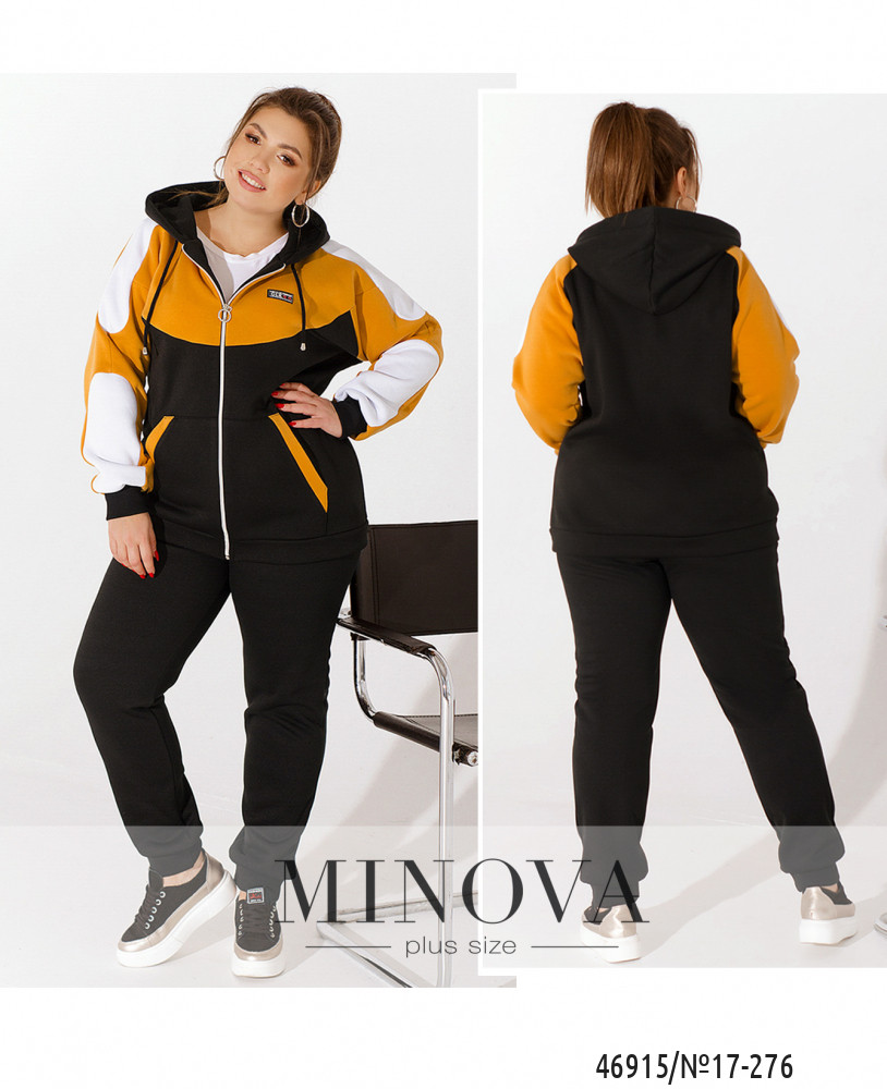 Яркий спортивный костюм, выполненный из мягкой ткани, позволит создавать стильные и разнообразные образы в уличном стиле. В комплект входят лаконичные однотонные брюки на резинке с карманами в боковых швах и манжетами, а также выразительная кофта, с яркими вставками, дополненная капюшоном, карманами по бокам и змейкой по центру.