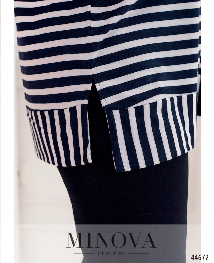 Элегантный и яркий костюм батал, блуза длинная, мягкая, через полукруглый вырез горловины под кулиской пропущен шнурок. Рукава с небольшими манжетами. По бокам подола - разрезы. Застёжек и карманов нет, подол также с манжетом. Брюки с высокой талией, в пояс вшита резинка, застёжек нет, по бокам - карманы в шве.