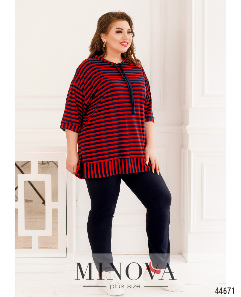 Элегантный и яркий костюм батал, блуза длинная, мягкая, через полукруглый вырез горловины под кулиской пропущен шнурок. Рукава с небольшими манжетами. По бокам подола - разрезы. Застёжек и карманов нет, подол также с манжетом. Брюки с высокой талией, в пояс вшита резинка, застёжек нет, по бокам - карманы в шве.