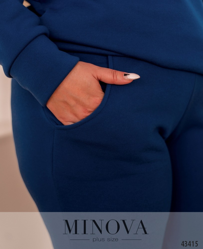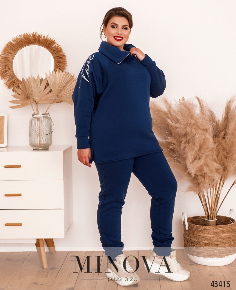 Стильный утеплённый костюм большого размера, на правом плече на кофте - яркий принт. Воротник высокий, с диагональной молнией до плеча. Карманов нет, по бокам подола - небольшие разрезы. Рукава с небольшими мягкими манжетами.  Брюки с высокой талией, по бокам - карманы, в пояс вшита резинка, снизу мягкие манжеты.