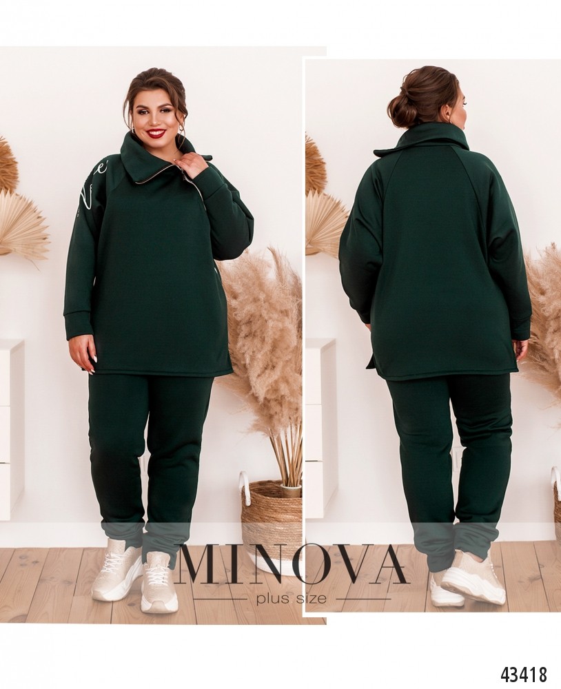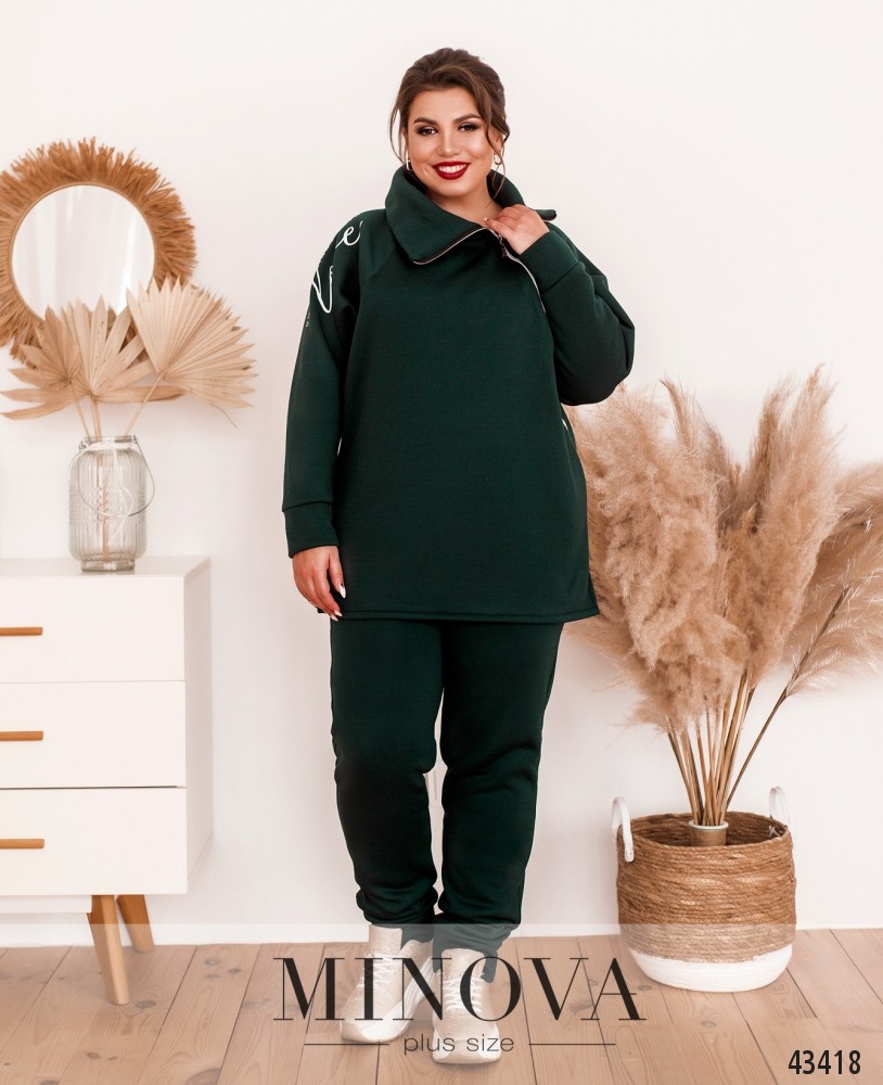Стильный утеплённый костюм большого размера, на правом плече на кофте - яркий принт. Воротник высокий, с диагональной молнией до плеча. Карманов нет, по бокам подола - небольшие разрезы. Рукава с небольшими мягкими манжетами. Брюки с высокой талией, по бокам - карманы, в пояс вшита резинка, снизу мягкие манжеты.