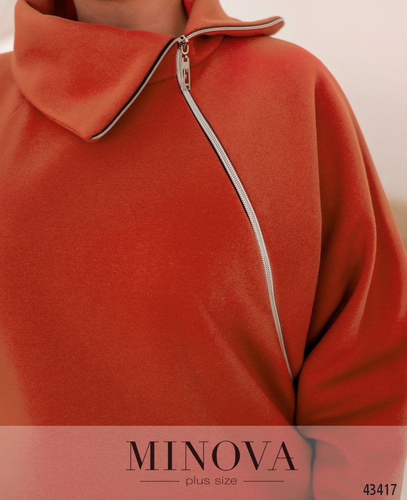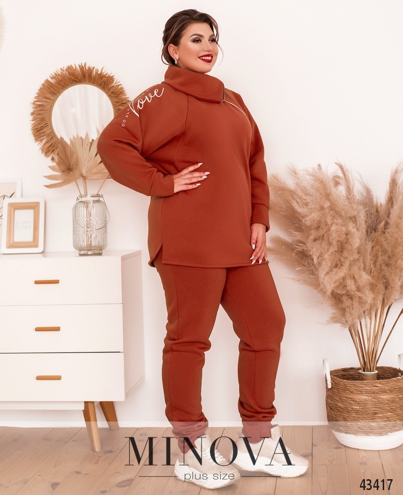 Стильный утеплённый костюм большого размера, на правом плече на кофте - яркий принт. Воротник высокий, с диагональной молнией до плеча. Карманов нет, по бокам подола - небольшие разрезы. Рукава с небольшими мягкими манжетами. Брюки с высокой талией, по бокам - карманы, в пояс вшита резинка, снизу мягкие манжеты.