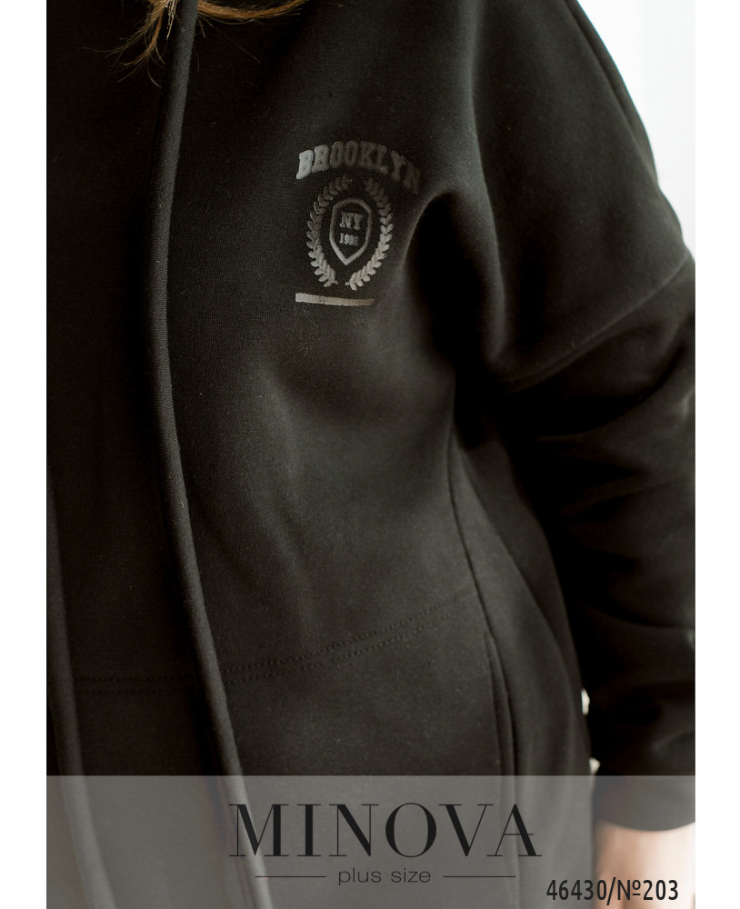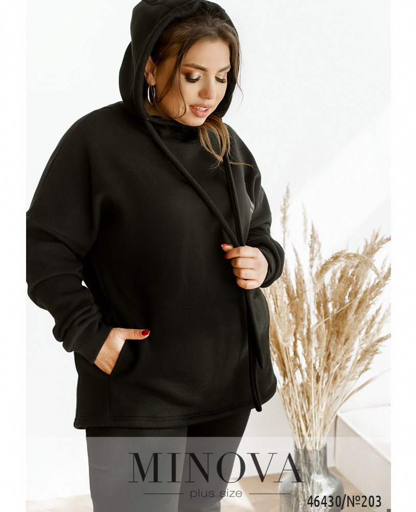 Уютный утепленный спортивный костюм не только очень теплый, но и комфортный. Комфортный худи с капюшоном и длинными рукавами привлекает внимание прежде всего оригинальным карманом, расположенным спереди, который выглядит как два кармана, расположенных по бокам. Также в комплект входят минималистичные брюки на резинке.