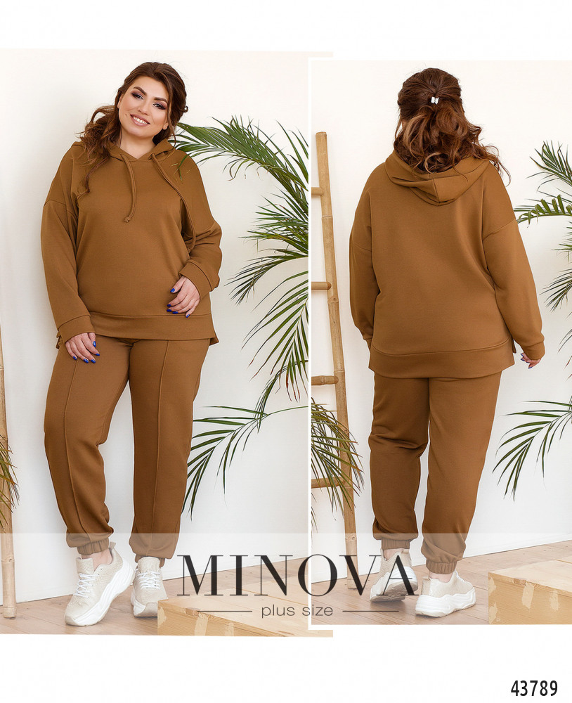 Комфортный и элегантный спортивный костюм большого размера из модной и практичной натуральной ткани. Толстовка с капюшоном, через него пропущен шнурок; карманов и застёжек нет, рукава и подол с мягкими манжетами. По бокам подола небольшие разрезы, спинка немного длиннее. Брюки со вшитой в пояс и в манжеты резинкой, посадка высокая, по бокам - карманы.