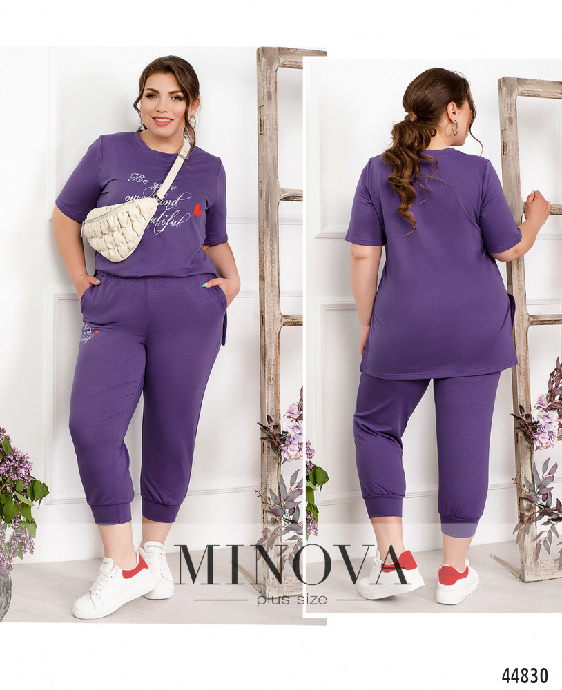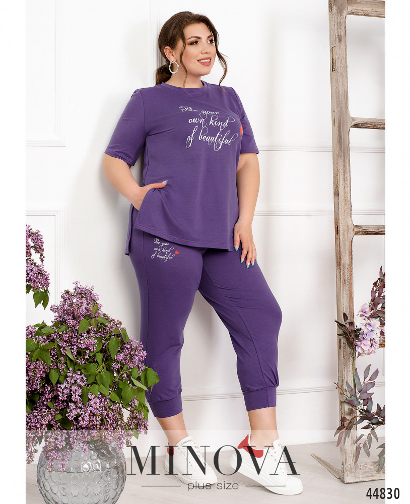 Привлекательный костюм-двойка плюс сайз. Футболка мягкая, с ярким стильным принтом на груди, вырез горловины полукруглый, рукава без манжет, по бокам - небольшие разрезы на подоле. Карманов и застёжек нет. Брюки с высокой талией, с мягкими манжетами, в пояс вшита резинка, по бокам - карманы в шве.