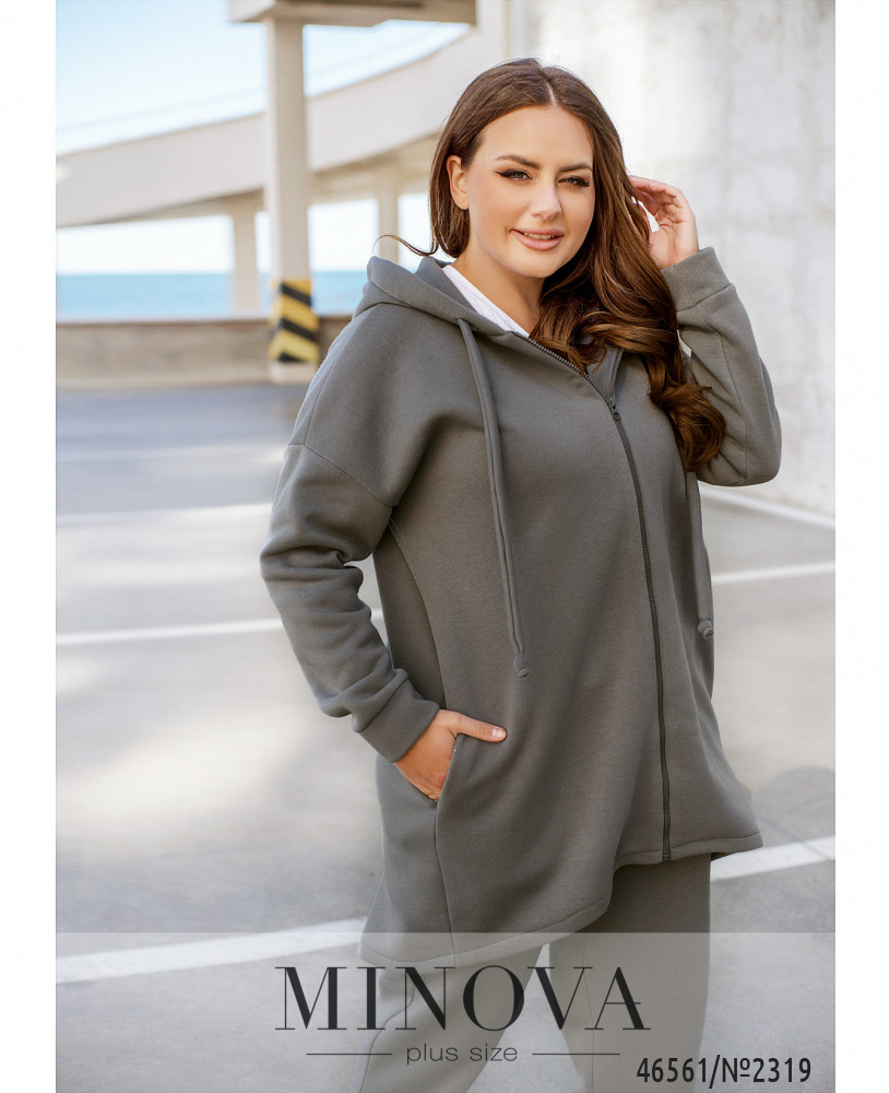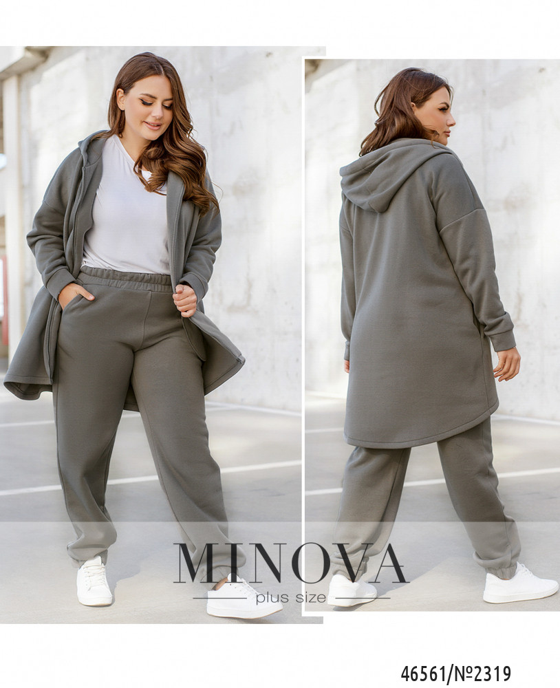 Монохромный утепленный спортивный костюм — идеальный вариант для любителей комфортного минимализма. В комплект входят лаконичные брюки-джоггеры на резинке с карманами в боковых швах, а также удлиненная кофта-туника на змейке с капюшоном и карманами, изюминкой которой являются рукава с манжетами и приспущенной линией плеч и ассиметричный низ, удлиненный по спинке.