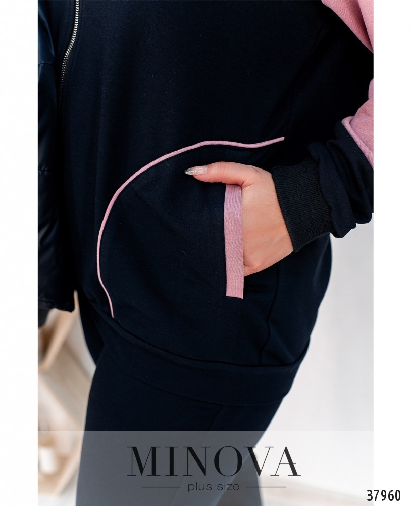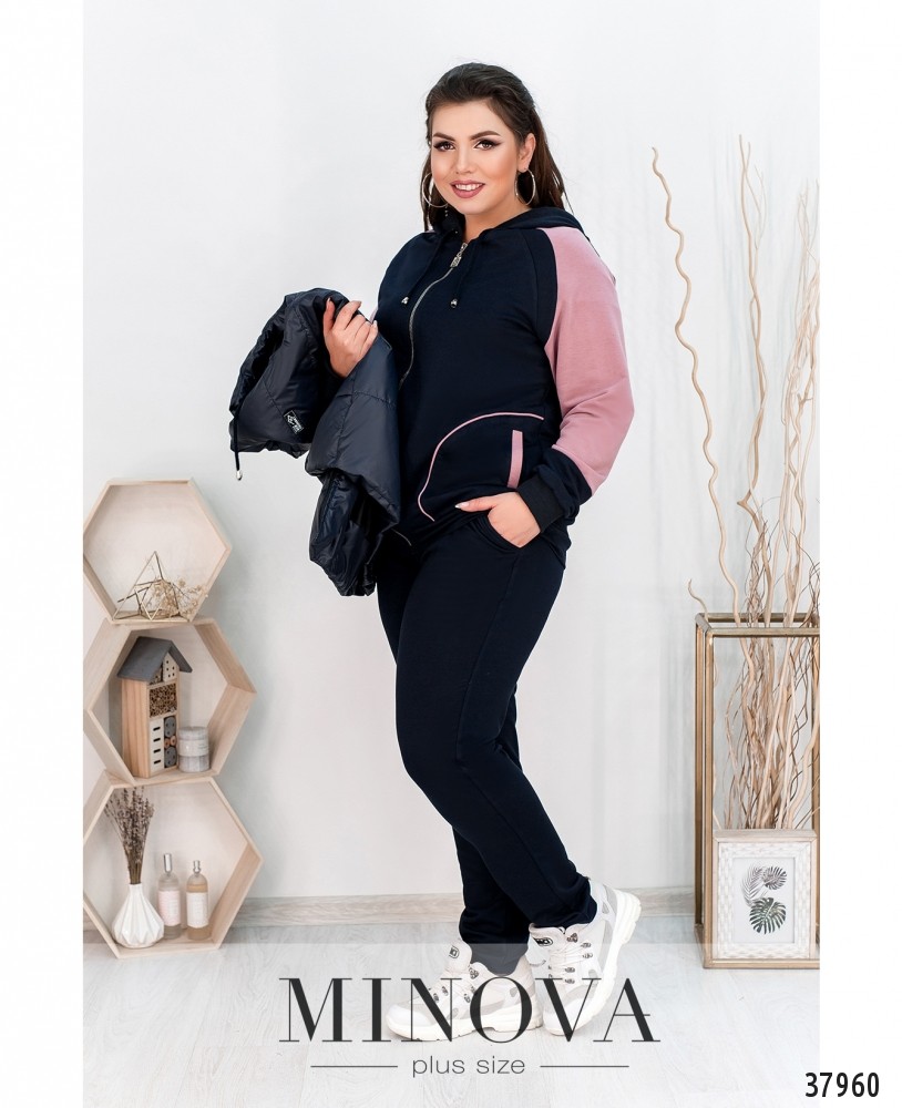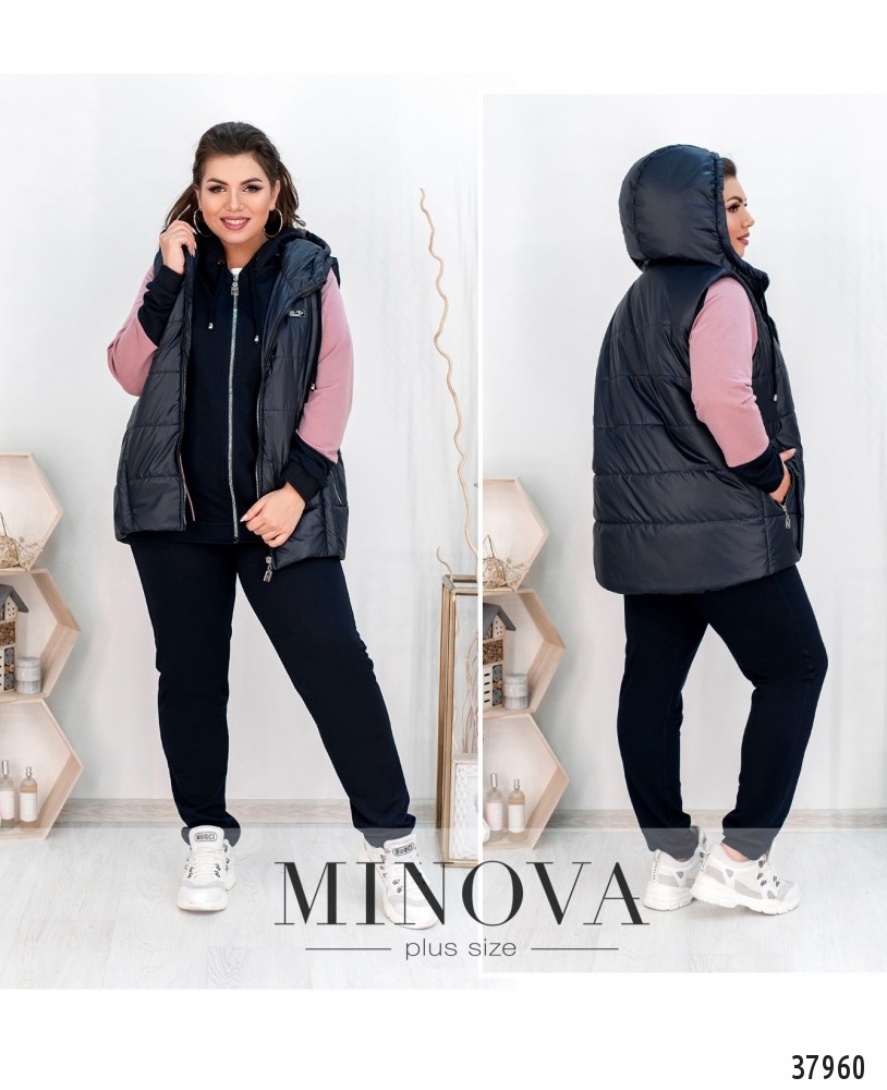 Стильный костюм-тройка с жилеткой, кофтой и брюками. Жилетка с подкладкой, простёгана поперечными и продольными швами, по бокам – врезные карманы под молнией, в наличии капюшон с шнурками, на левой стороне груди – декоративная нашивка, застёжка – молния по центру. Кофта с капюшоном, застёгивается на змейку во всю длину, по бокам – врезные карманы под контрастными листочками, рукава с мягкими манжетами. Брюки со вшитой в пояс резинкой, по бокам врезные карманы, посадка высокая.