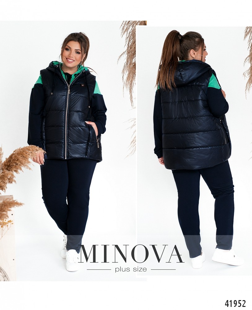 Привлекательный костюм-тройка батал с жилеткой. Жилетка простёгана, с карманами и декоративным швом, с подкладкой, застёгивается на молнию. Через капюшон пропущен шнурок. Свитшот с молнией по центру, с карманами по бокам, на рукавах мягкие манжеты, в наличии капюшон со шнурком. Брюки с высокой талией, в пояс вшита резинка, по бокам врезные карманы.
