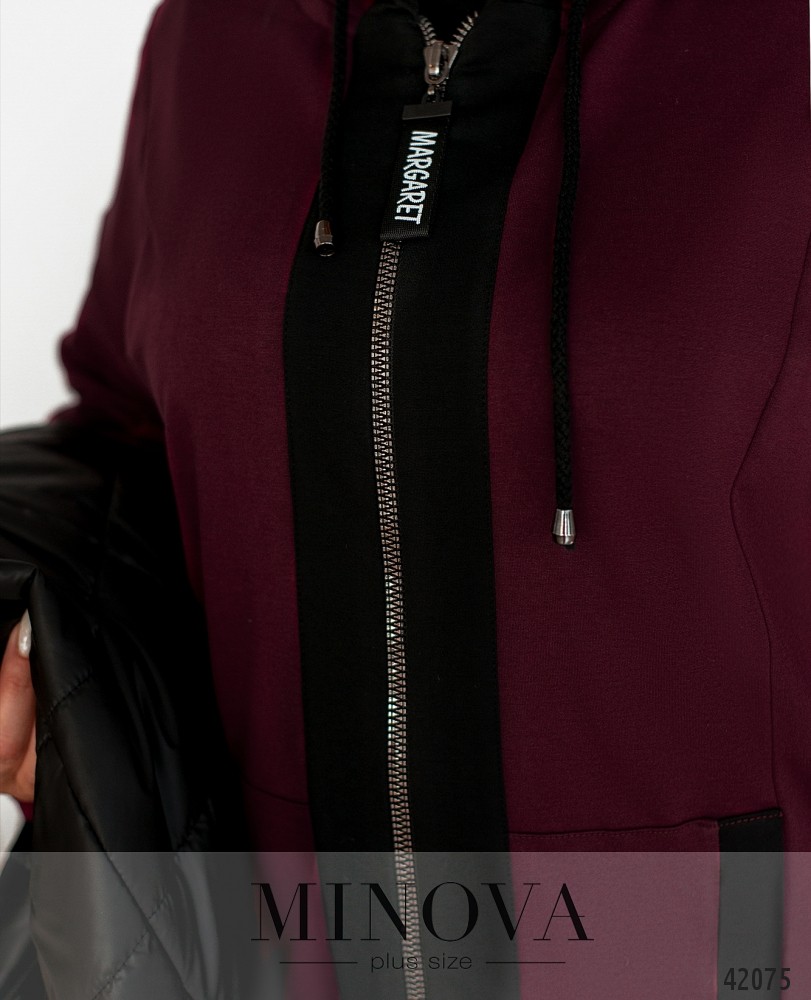 Мягкий и тёплый костюм-тройка батал. Жилетка с врезными карманами по бокам, застёгиваются на молнию, молния расположена также по центру, в наличии капюшон. Жилетка простёганная. Брюки с высокой талией, по бокам - врезные карманы, в пояс вшита резинка. Кофточка с молнией по центру, с врезными карманами, рукава с мягкими манжетами, в наличии капюшон.