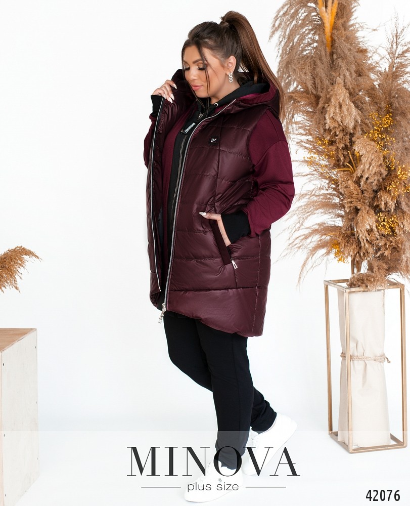 Мягкий и тёплый костюм-тройка батал. Жилетка с врезными карманами по бокам, застёгиваются на молнию, молния расположена также по центру, в наличии капюшон. Жилетка простёганная. Брюки с высокой талией, по бокам - врезные карманы, в пояс вшита резинка. Кофточка с молнией по центру, с врезными карманами, рукава с мягкими манжетами, в наличии капюшон.