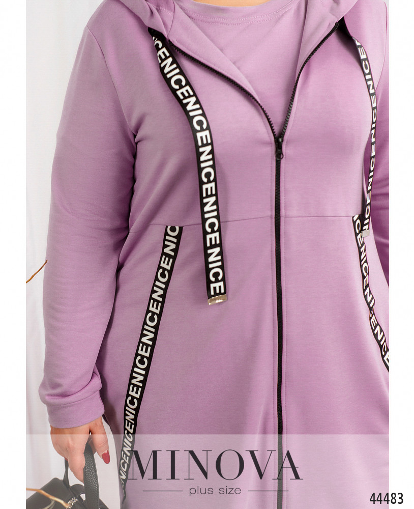 Оригинальный костюм-тройка плюс сайз. Толстовка длинная, украшена яркими лентами, такие же ленты, но с металлическими наконечниками, пропущены через капюшон. Подкладки нет, по бокам - карманы в шве. Рукава с небольшими мягкими манжетами. Футболка с коротким рукавом с мягким манжетом, вырез горловины полукруглый, застёжек и карманов нет. Брюки с высокой талией, в пояс вшита резинка, застёжек нет, по бокам карманы в шве.