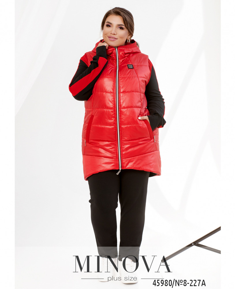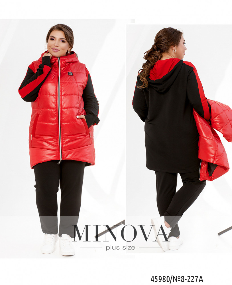 Костюм-тройка большого размера. Жилетка простёгана, по бокам - врезные карманы под молнией, застёгивается на молнию, молния с двумя бегунками, изнутри подкладка. Свитшот с капюшоном и карманами, на груди декоративная нашивка, на рукавах лампасы. Застёгивается на молнию с двумя бегунками. Брюки однотонные, в пояс вшита резинка, посадка высокая, по бокам врезные карманы.