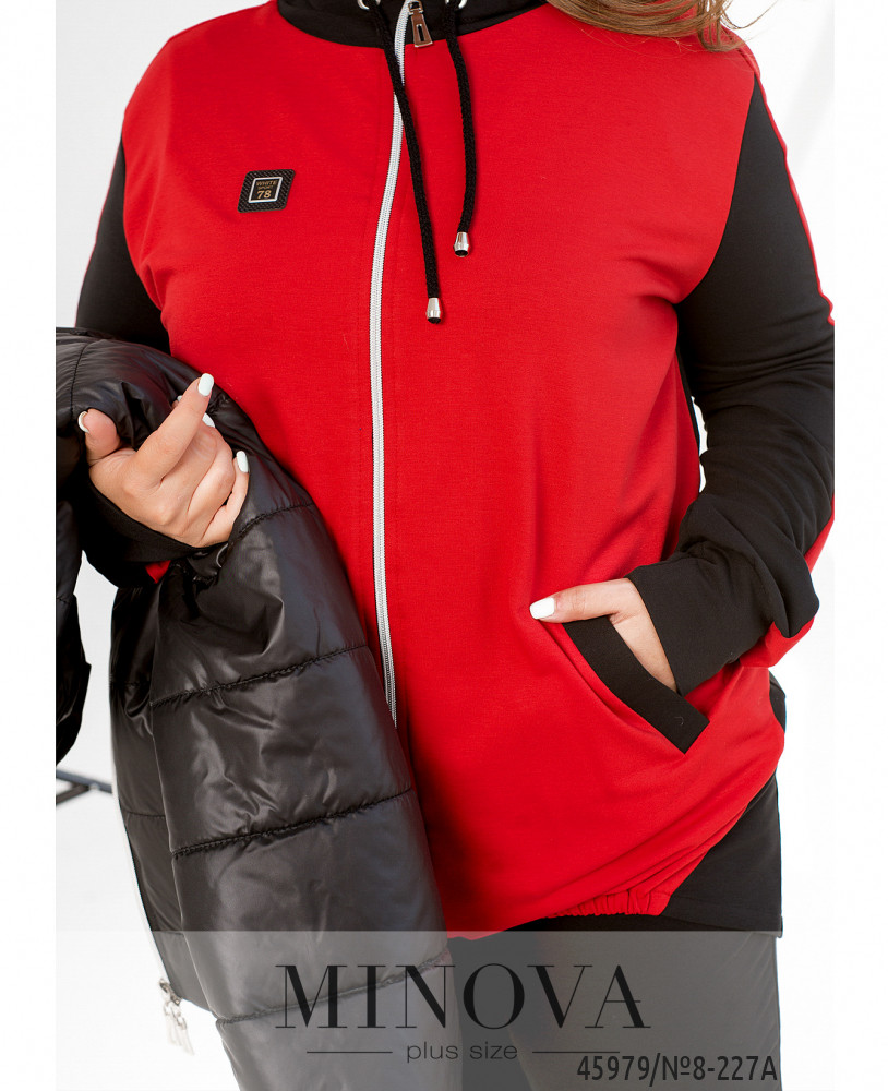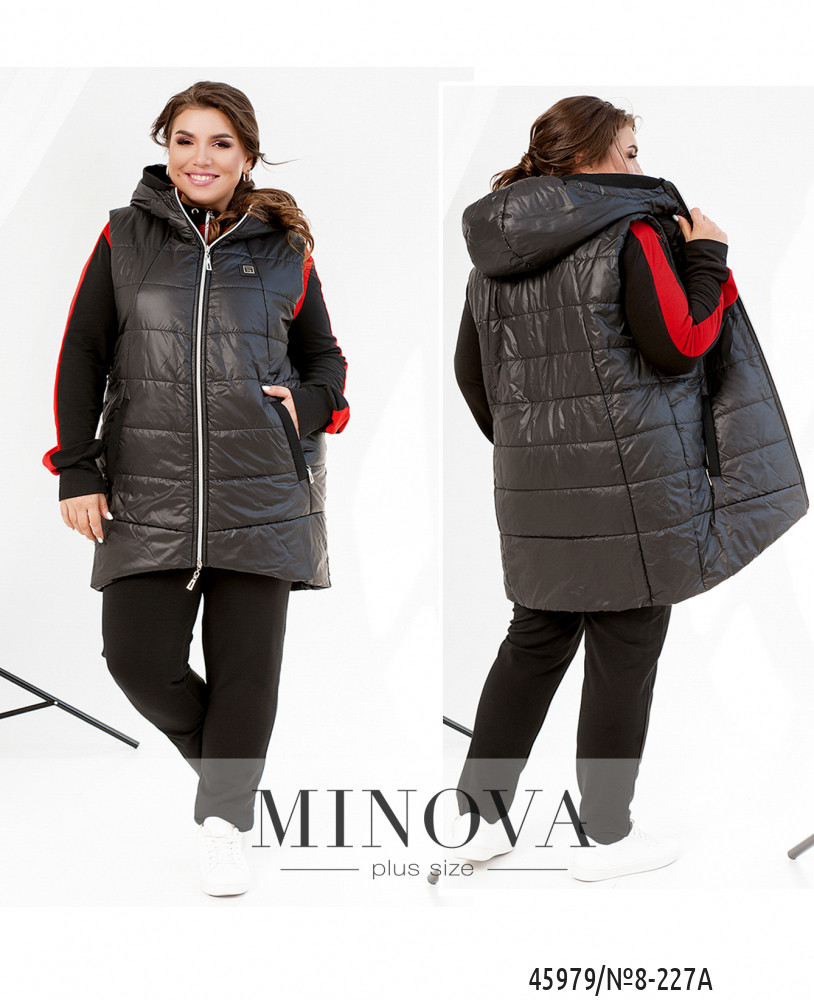 Костюм-тройка большого размера. Жилетка простёгана, по бокам - врезные карманы под молнией, застёгивается на молнию, молния с двумя бегунками, изнутри подкладка. Свитшот с капюшоном и карманами, на груди декоративная нашивка, на рукавах лампасы. Застёгивается на молнию с двумя бегунками. Брюки однотонные, в пояс вшита резинка, посадка высокая, по бокам врезные карманы.