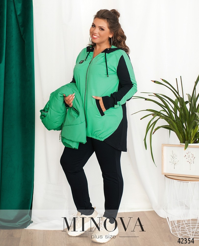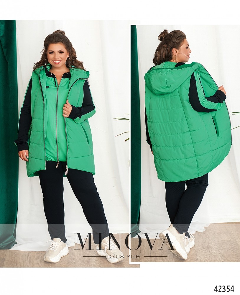 Костюм-тройка большого размера. Жилетка простёгана, по бокам - врезные карманы под молнией, застёгивается на молнию, молния с двумя бегунками, изнутри подкладка. Свитшот с капюшоном и карманами, на груди декоративная нашивка, на рукавах лампасы. Застёгивается на молнию с двумя бегунками. Брюки однотонные, в пояс вшита резинка, посадка высокая, по бокам врезные карманы.