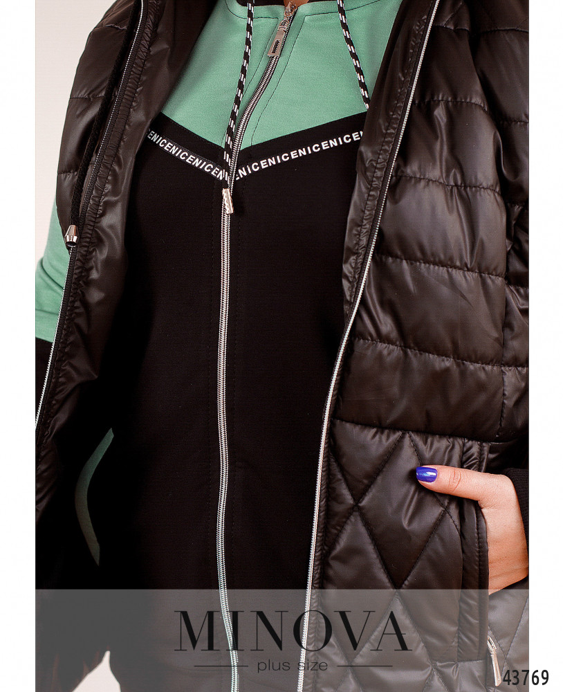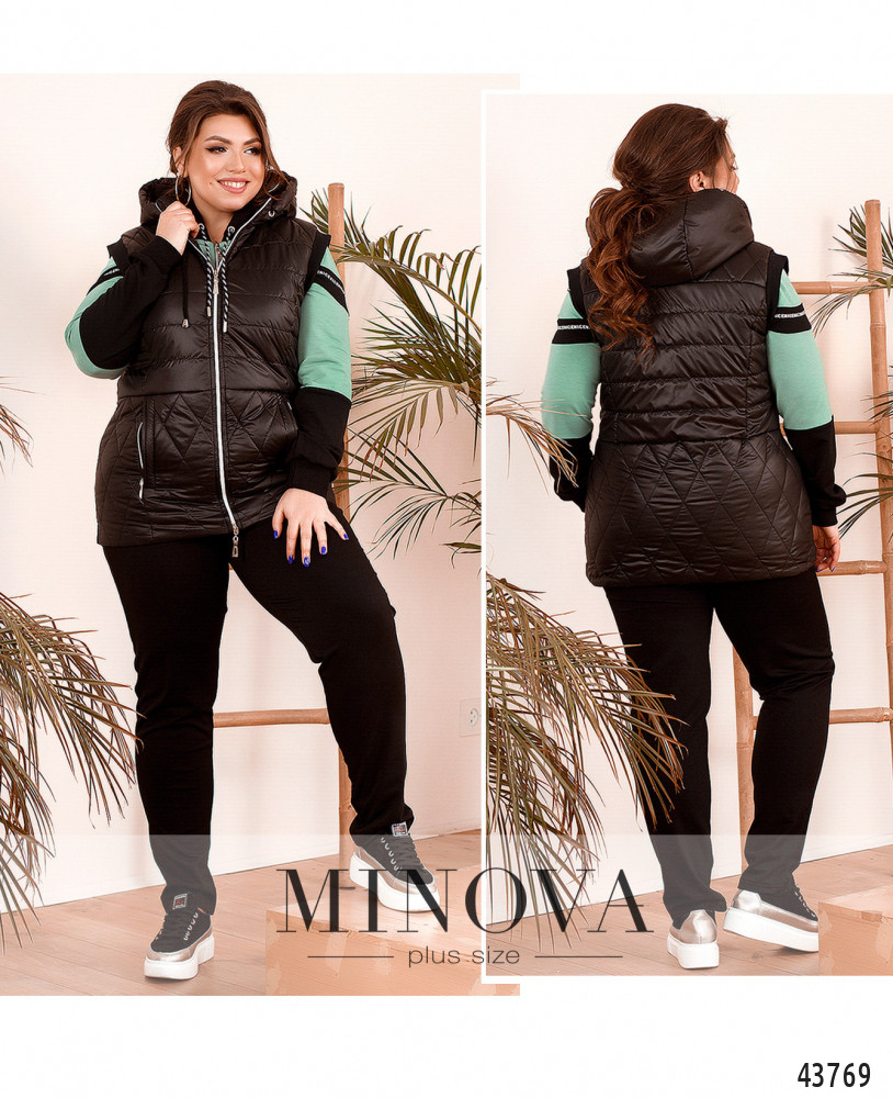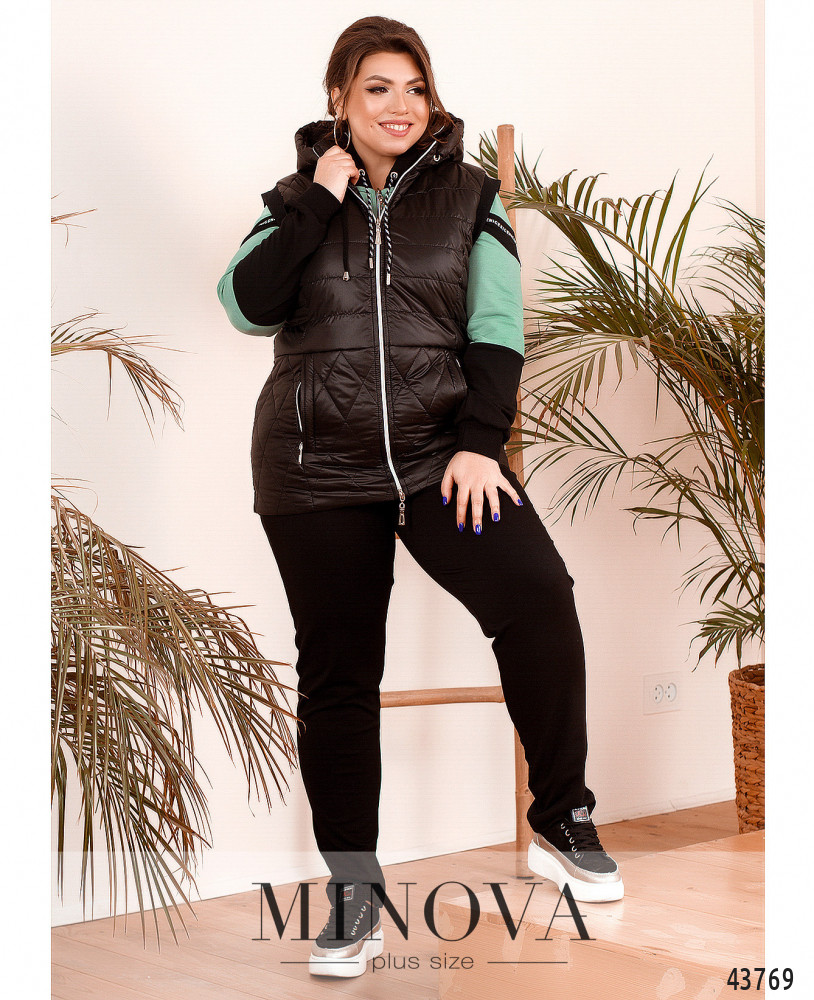 Удобный и стильный костюм-тройка батал, жилет из простёганной разнонаправленными стежками ткани. Жилет с подкладкой, с капюшоном, который не отстёгивается, через него пропущен шнурок. По бокам - врезные карманы под молнией. По центру - молния. Проймы с резинкой. Толстовка с молнией по центру, через капюшон пропущен шнурок, рукава и подол с манжетами. Декорирована лентой с принтом. Брюки с высокой посадкой и врезными карманами по бокам, в пояс вшита резинка.