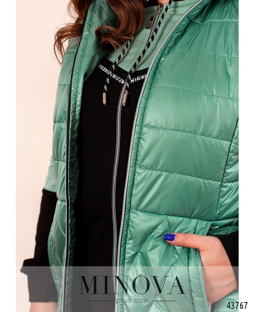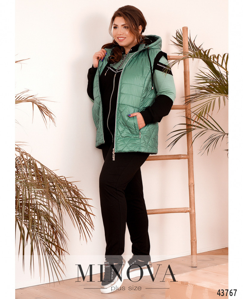 Удобный и стильный костюм-тройка батал, жилет из простёганной разнонаправленными стежками ткани. Жилет с подкладкой, с капюшоном, который не отстёгивается, через него пропущен шнурок. По бокам - врезные карманы под молнией. По центру - молния. Проймы с резинкой. Толстовка с молнией по центру, через капюшон пропущен шнурок, рукава и подол с манжетами. Декорирована лентой с принтом. Брюки с высокой посадкой и врезными карманами по бокам, в пояс вшита резинка.