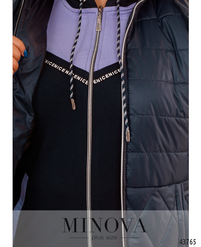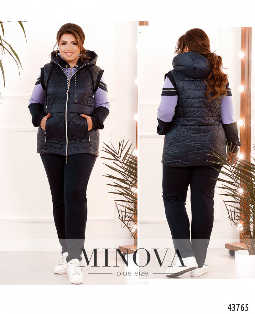 Удобный и стильный костюм-тройка батал, жилет из простёганной разнонаправленными стежками ткани. Жилет с подкладкой, с капюшоном, который не отстёгивается, через него пропущен шнурок. По бокам - врезные карманы под молнией. По центру - молния. Проймы с резинкой. Толстовка с молнией по центру, через капюшон пропущен шнурок, рукава и подол с манжетами. Декорирована лентой с принтом. Брюки с высокой посадкой и врезными карманами по бокам, в пояс вшита резинка.