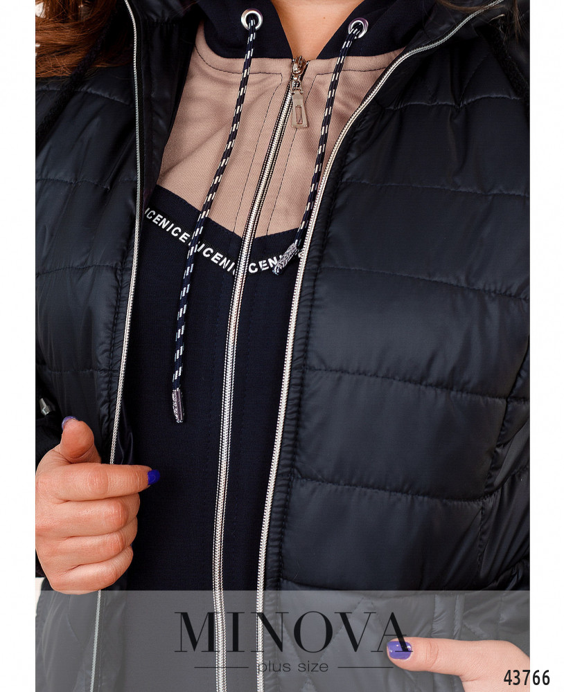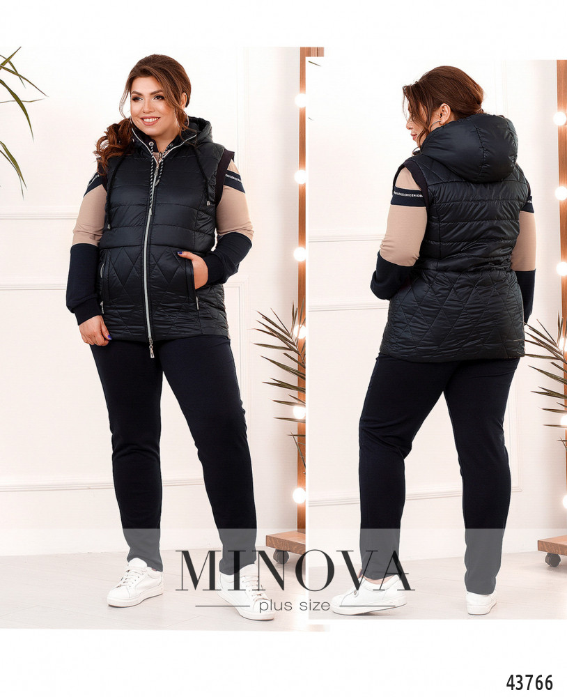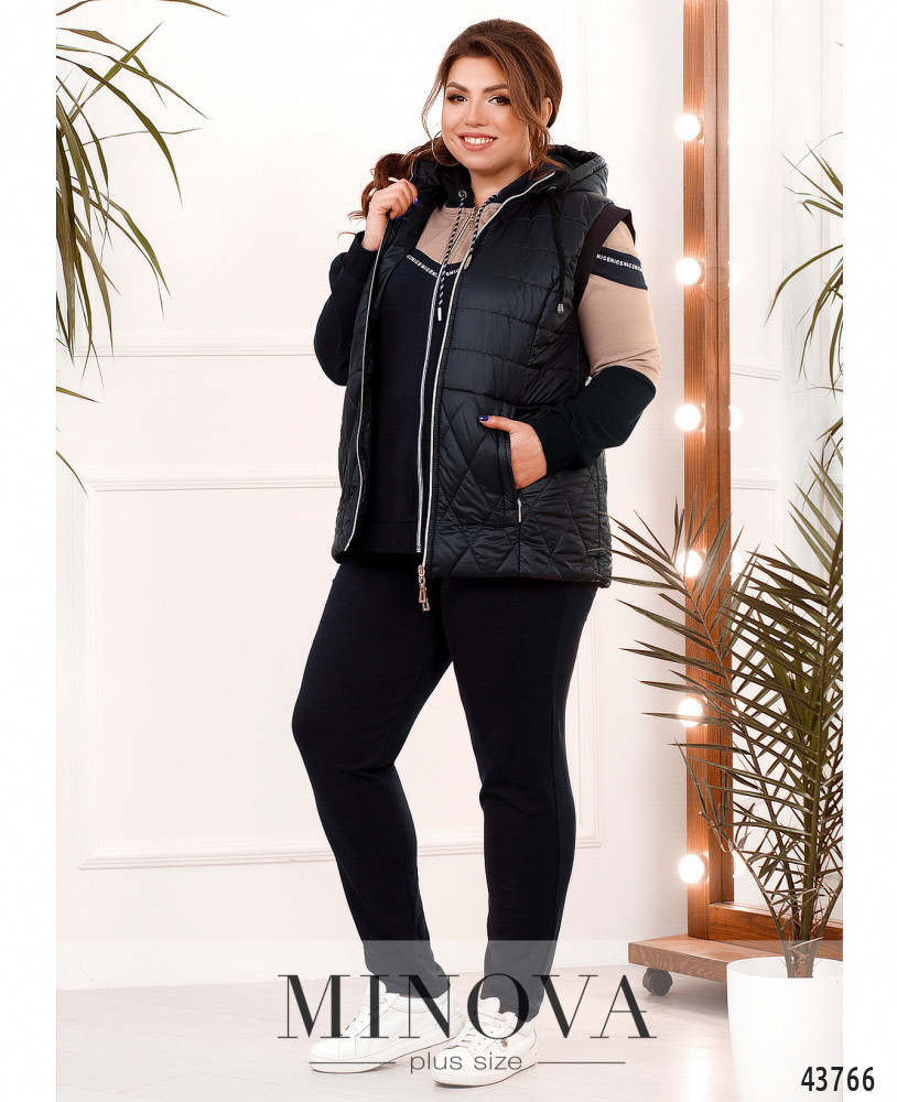 Удобный и стильный костюм-тройка батал, жилет из простёганной разнонаправленными стежками ткани. Жилет с подкладкой, с капюшоном, который не отстёгивается, через него пропущен шнурок. По бокам - врезные карманы под молнией. По центру - молния. Проймы с резинкой. Толстовка с молнией по центру, через капюшон пропущен шнурок, рукава и подол с манжетами. Декорирована лентой с принтом. Брюки с высокой посадкой и врезными карманами по бокам, в пояс вшита резинка.