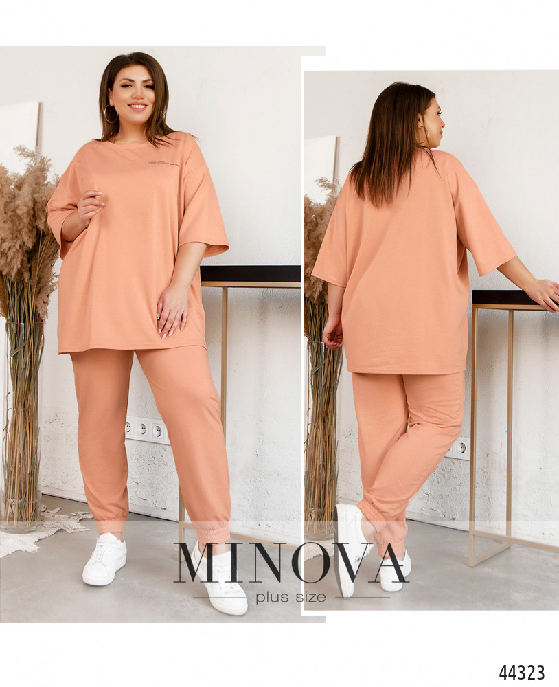 Стильный костюм-двойка большого размера, футболка с рукавами без манжет, вырез горловины полукруглый, без застёжек и карманов. Брюки со вшитой в манжеты и в пояс резинкой, по бокам - карманы в шве, талия высокая.