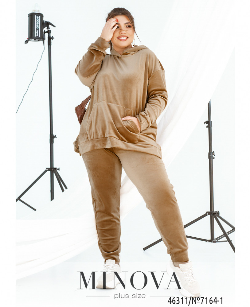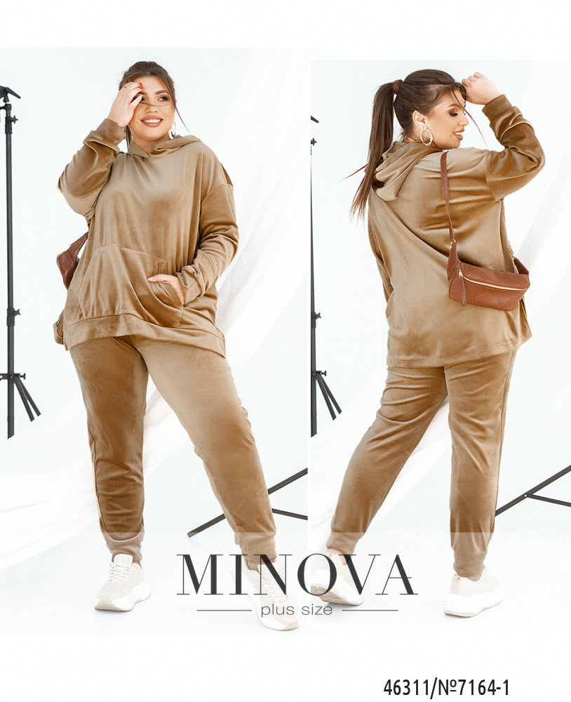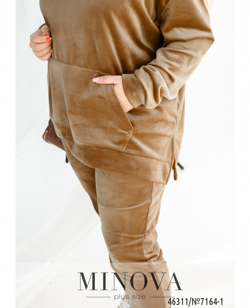 Теплый и комфортный спортивный костюм, выполненный из мягкого велюра, привлекает внимание необычной фактурой и удобством. Лаконичные брюки на резинке с карманами и манжетами дополнены уютным худи с капюшоном и карманом-кенгуру. Эта модель с характерным спортивным шиком порадует поклонниц практичной одежды на каждый день.