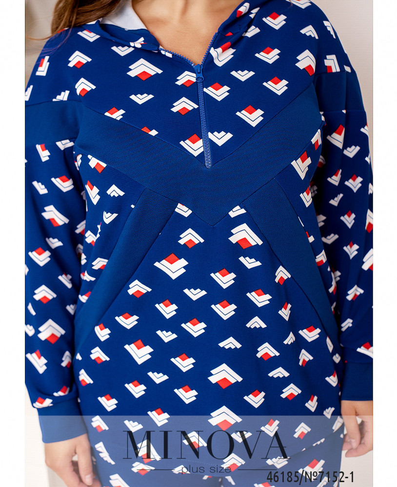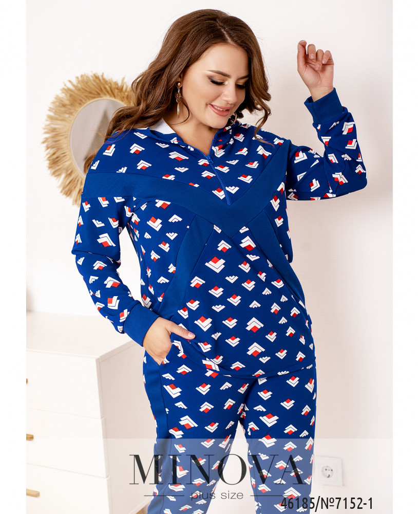 Яркий комфортный спортивный костюм с игривым принтом поднимет настроение даже в самый хмурый день. В комплект входит худи с капюшоном, длинными рукавами и змейкой на груди, а также брюки-джоггеры на резинке с карманами, украшенные однотонными лампасами в цвет костюма.