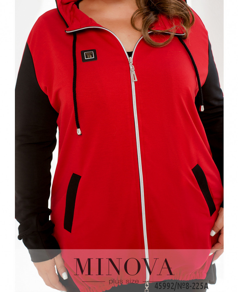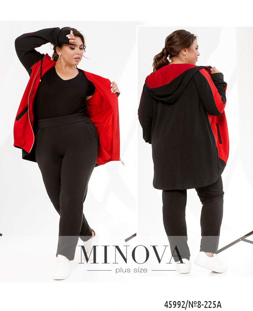 Удобный и яркий повседневный костюм-двойка батал в спортивном стиле. Кофта с молнией по центру, застёгивается на два бегунка, по бокам - карманы, рукава с мягкими манжетами, в наличии капюшон, через него пропущен шнурок. Брюки с высокой посадкой, по бокам - карманы, в пояс вшита резинка, без манжет.