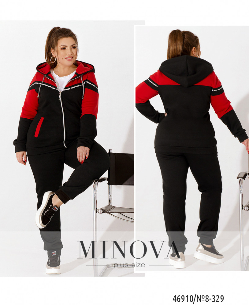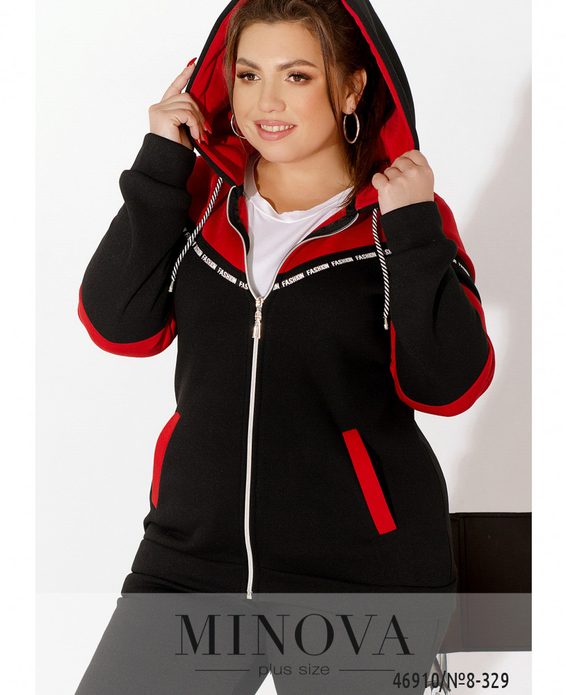 Оригинальный яркий костюм батал подарит тепло и комфорт в прохладные дни. Кофта с карманами и капюшоном, декорированая яркой лентой с принтом спереди и на рукавах с манжетами, застёгивается на молнию спереди по центру. Брюки с высокой талией на резинке дополнены карманами в боковых шва и манжетами.