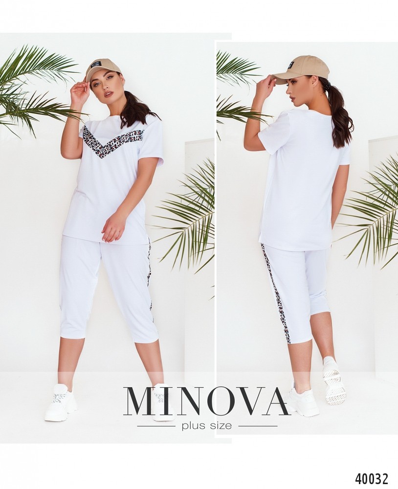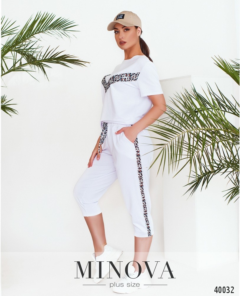 Стильный спортивный костюм большого размера с актуальным принтом на футболке и на брюках в виде лампас. Футболка без карманов и застёжек, брюки со вшитой в пояс резинкой, по бокам врезные карманы, посадка высокая.